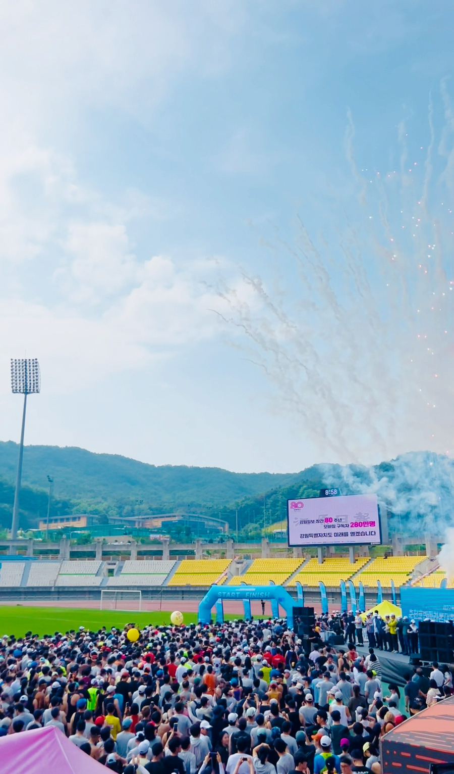 대회장에 들어서자마자 엄청난 열기가 온몸을 감쌌다. 워밍업을 하는 사람들, 기념사진을 찍는 이들, 그리고 꽝꽝 울려 퍼지는 음악 소리까지, 모든 것이 활기로 넘쳐났다. 남편이 몸을 풀기 위해 달리는 동안 나는 출발선과 피니시 라인의 위치를 살피느라 분주했다. 여기저기서 풍겨오는 파스 냄새는 코끝을 알싸하게 자극했다. 사람들이 덜 붐비는 응원석으로 자리를 옮겨 경기장을 내려다보았다.