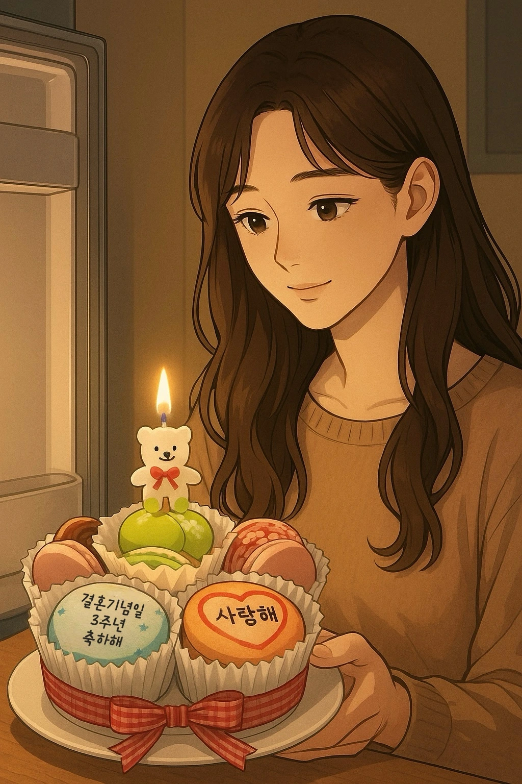 남편이 의아한 표정으로 냉장고 문을 열었다. 그러고는 첫 번째로 마카롱 케이크를 보고 웃었고, 두 번째로 케이크 위의 문구를 보고 또 웃었으며, 세 번째로 내 편지를 발견하고 한 번 더 웃었다. ‘역시 편지보다 마카롱이 먼저인가 보다.’ 속으로 웃으며 남편의 반응을 슬쩍 살폈다. 그러던 중 편지를 읽다가 코를 훌쩍거리는 소리가 들렸다. ‘잘못 들은 건가?’ 하며 가까이 다가가자, 남편의 눈가가 붉게 물들어 있었다. ‘아, 이 사람도 오늘 많이 힘들었구나.’ 나도 울컥했지만, 괜히 놀리듯 장난을 걸며 웃었다. 강아지 밥을 챙긴 뒤, 남편이 예약해둔 레스토랑으로 향했다.
