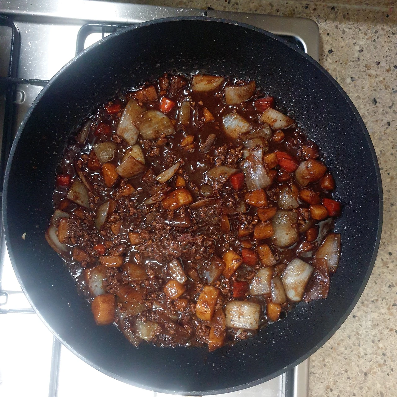 3. 감자가 푹 익을 때쯤 춘장을 넣고 물을 한 컵정도 자작하게 넣고 설탕을 넣으며 간을 맞춘다.