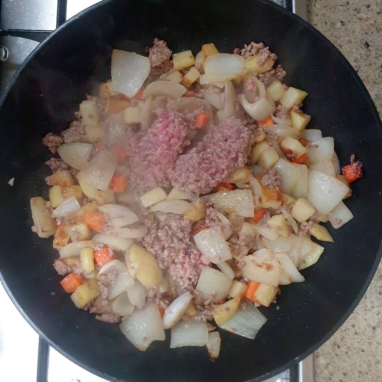 1. 넉넉히 기름을 두른 팬에 양파. 당근. 감자를 넣고 양파가 투명해질 때까지 볶아준다.(빠른 조리를 위해 작게 잘라준다)
