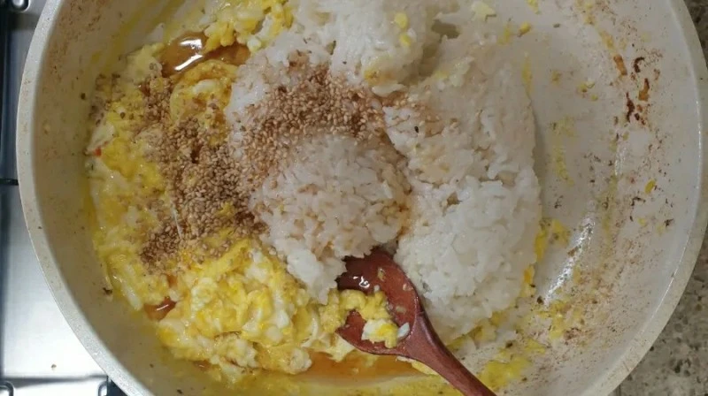 밥. 계란. 참기름. 깨소금