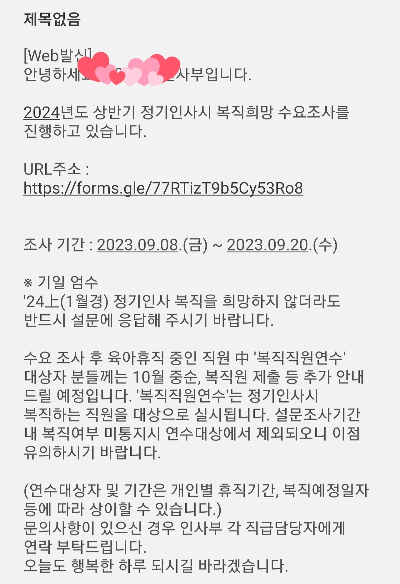 첫째 아이 휴직 때만 하더라도 2년의 휴직을 쓸 수 있었는데 복직을 하고 난 이후 출산장려정책으로 초등학교 휴직 1년이 더 생겼다.