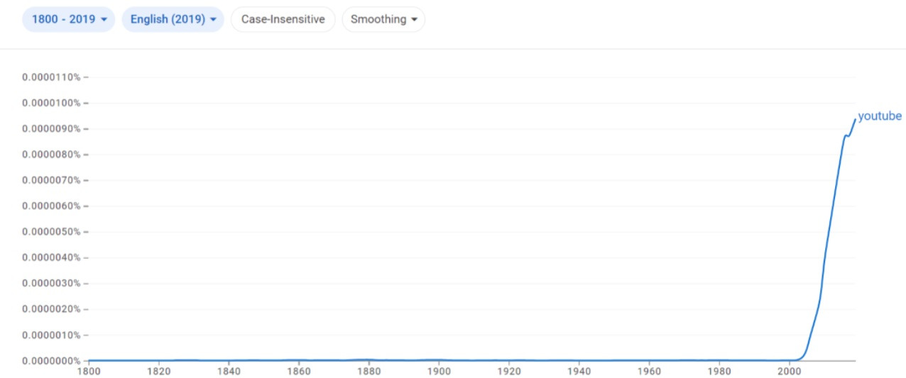 구글 N뷰어에서 유튜브라는 용어를 사용하기 시작한 시점을 찾아보았다. 유튜브라는 매체를 사람들에게 서서히 알리기 시작한 때는 2000년도 이후부터 이다.