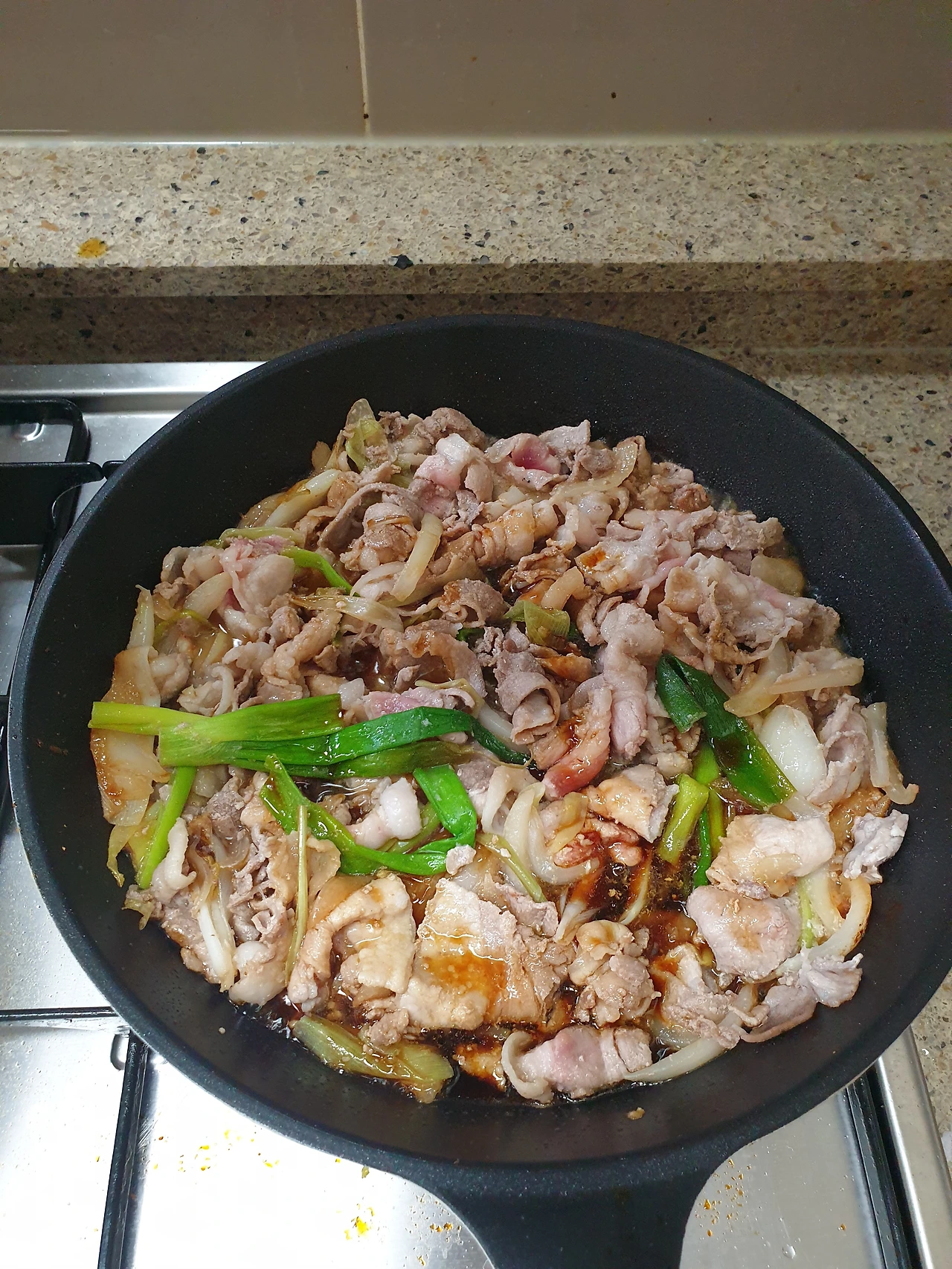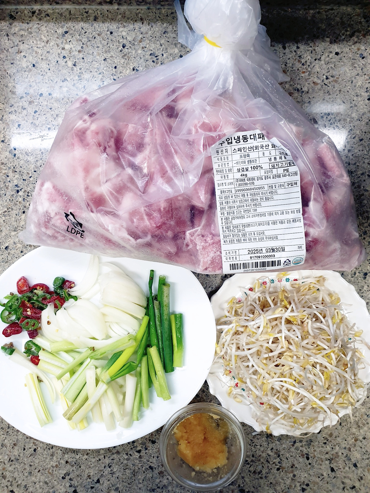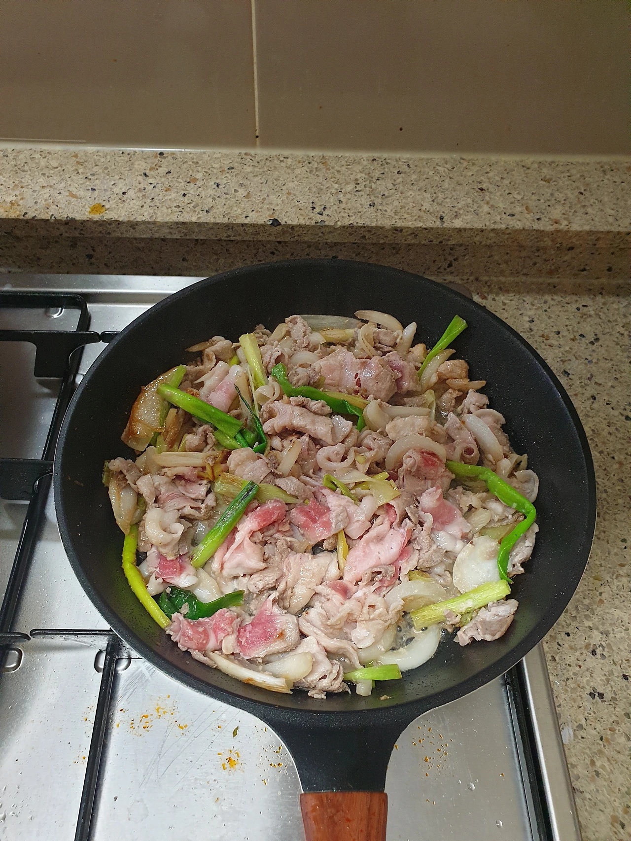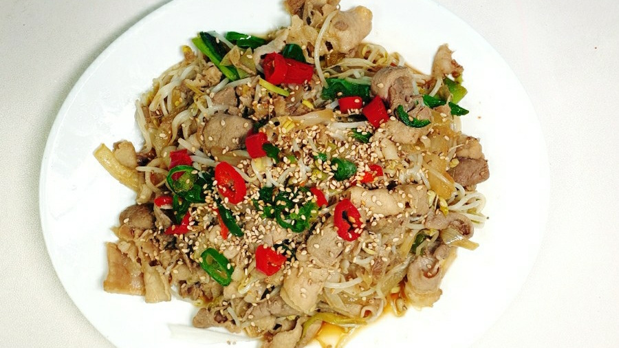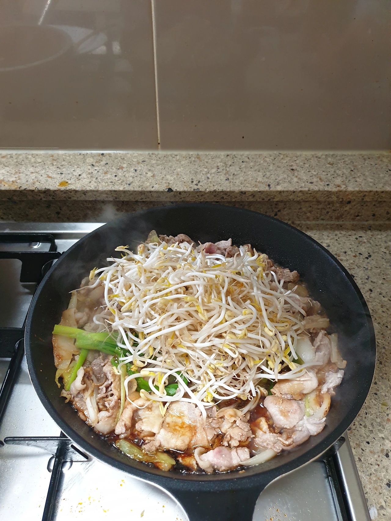 | 준비재료대패삼겹, 양파, 대파, 숙주, 고추, 다진마늘(편마늘)(양념: 진간장, 굴소스, 참기름)
