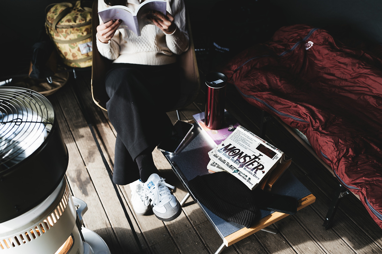 쉘터에 햇빛이 들어오도록 했고 난로를 켜두어 포근하고 편안한 느낌이 더했다. 평일 오후는 주말보다 느긋한 느낌을 많이 준다. 포근하고 느긋한 분위기에 아웃도어에서 만화책을 읽는 시간은 매력적이었다.