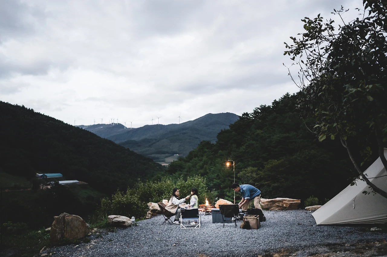 도착 후 익숙한 위치에 자리 잡았고, 이른 저녁식사를 시작했다. 들뜬 딸은 식사하며 여기저기 돌아다니며 놀이를 하기도 했고 장난을 치기도 했다. 오랜만에 산속에서의 시간에 행복해하고 있을 때, 빗방울이 조금씩 떨어지기 시작했다. 빠르게 자리를 정리하고 짐들을 텐트 안으로 옮겼다. 비는 예보에 없었기 때문에 당황스러웠다. 많은 비로 계획보다 일찍 돌아간 작년 이곳에서의 캠핑이 생각났다.