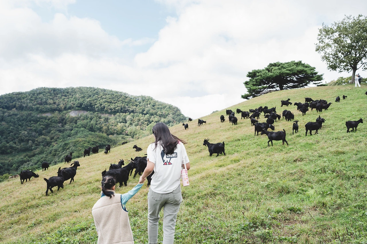 작년 이곳에 왔을 땐 계획보다 먼저 돌아가는 바람에 육십 마지기에 오르지 못했었다. 이번 캠핑에선 꼭 가야겠다고 하고 있었고, 셋째 날 산을 올랐다. 트래킹을 처음 한 딸은 언제 도착하냐고 여러 번 물었고 다리 아프다고도 여러 번 이야기했지만, 우리 셋은 함께 노래 부르며 걸었다. 걷다 보니 흑염소들이 몇 마리 보이기 시작했다. 딸은 그때부터 힘든것도 모르고 호기심 가득한 표정이었고, 정상에 도착하니 한가한 시간을 보내고 있는 많은 흑염소들을 만날 수 있었다. 멋진 광경이었다. 자연친화적인 장면들이 주는 좋은 느낌도 있었고, 딸이 커서 우리 손을 잡고 산에 올랐다는 사실도 뭉클했다. 언제 이렇게 컸는지 모르겠다. 딸이 크는 모습을 보는 건 늘 행복하기도 슬프기도 하다.