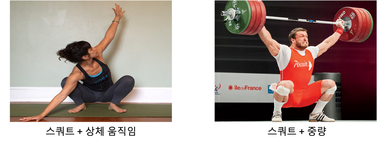 일반적으로 요가는 유연하고 부드러운 움직임을 생각할 것이다. 그리고 역도는 단단하고 힘이 넘치는 움직임을 생각할 것이다. 사진을 보면 그들의 외모만큼이나 움직임에도 큰 차이가 있다고 느낄 것이다. 하지만 그들의 움직임은 생체역학적으로 큰 차이가 없다. 둘 다 쪼그려 앉는 스쿼트를 하고 있다. 다만 어떻게 신경반응을 하고 있는지가 중요하다. 같은 스쿼트이지만 스쿼트 자세에서 더 많은 움직임과 유연성을 요구하는 요가와 스쿼트 자세에서 무거운 중량을 버텨야 하는 역도는 신경세포의 발달과정이 전혀 다르다고 볼 수 있다.
