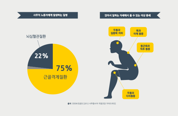 앉아서 오랫동안 일을 하는 좌업은 큰 부담이 없어 보이지만 장 시간 일을 하게 되면 척추에 많은 스트레스를 주고 통증을 유발하게 한다. 예로 사무직 종사자 75%는 근골격계 통증을 경험하고 있으며 이들 대부분은 3시간 동안 한 번도 일어나지 않는 업무 패턴이라는 연구 결과가 있다.