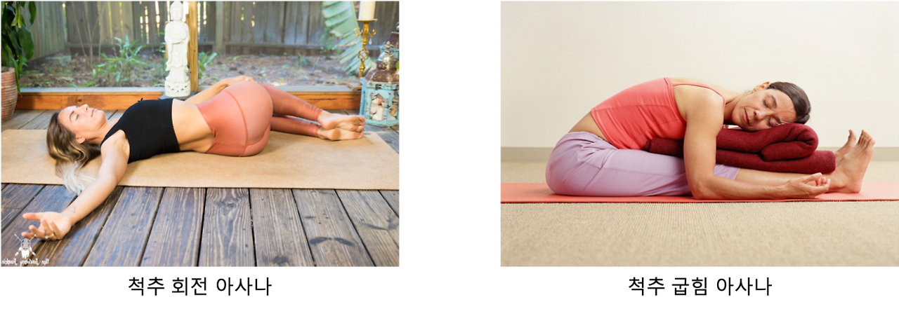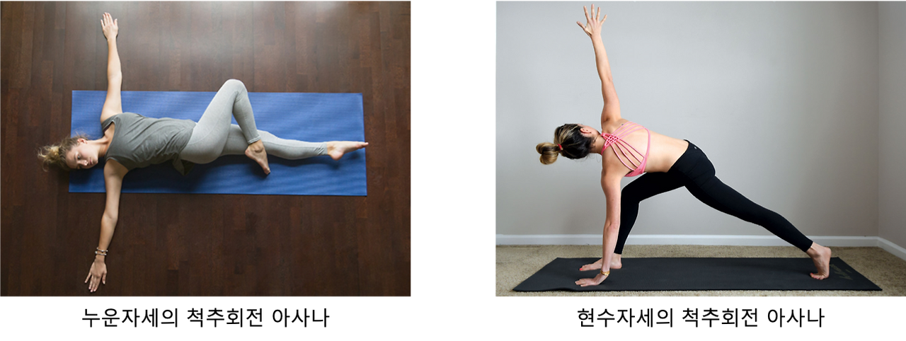 누운 자세 척추회전 아사나와 현수 자세 척추회전 아사나는 관절 입장에선 동일한 움직임이지만 자세에 따른 운동 강도의 차이가 크게 나타난다. 누운 자세는 몸에 대부분이 지면에 닿아 있어 근력을 필요로 하지 않지만 현수 자세나 서기 자세처럼 불안정한 자세에서는 중력에 대항하기 위한 추가적인 근력이 필요하기 때문에 상대적으로 더 힘이 들게 된다.