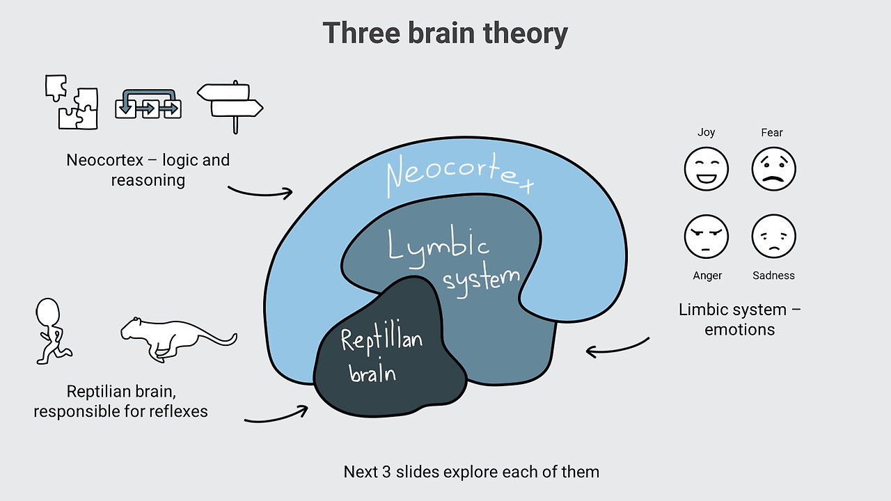 뇌간, 소뇌 : 주로 파충류가 해당되며 생명유지와 생존적인 투쟁을 위한 "감각"적인 영역