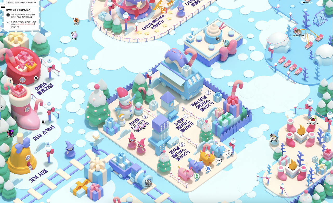 고민 끝에 나는 오비스에 출근하기로 했다. 21년 춥디 추운 겨울에 입사했지만 전혀 춥지 않았다. 출퇴근을 집에서 했으니까! 하지만 출퇴근을 제외하고는 메타버스라고 특별할 건 없었다. 여전히 첫 출근은 긴장됐고 이것저것 익히기 바쁜 날들이 정신없이 지나갔다. 내가 입사할 때 오리엔테이션은 따로 없었다. 눈치껏 팀원들에게 다가가서 인사하고 팀장님의 빈 시간을 공략해서 여러 가지 정보를 최대한 많이 알아둬야 했다. 오프라인 사무실에서 하는 것과 똑같은 일이었지만 메타버스 사무실에서는 훨씬 난이도가 높은 일이었다. 서로 얼굴도 알지 못하는 상태에서 아바타로만 다가가서 말을 거는 일은 보기보다 쉽지 않았다.