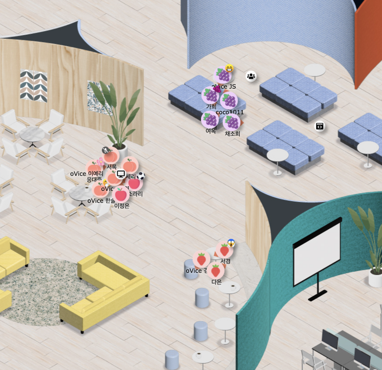 위 이미지를 보면 다양한 상태 표시가 한 번에 존재한다. 빨간색 테두리를 한 Amon은 지금 동료들과 함께 있지만 급하게 집중할 일이 있는 모양이다. 대표님과 Yuyama는 오브젝트에 연결된 상태로 이야기를 나누고 있다. 다른 동료들도 듣고 있거나 소통이 바로 가능한 상태다. 이로써 아바타를 통해 개인의 업무 효율성을 높이고, 업무에 집중할 수 있는 것이다.