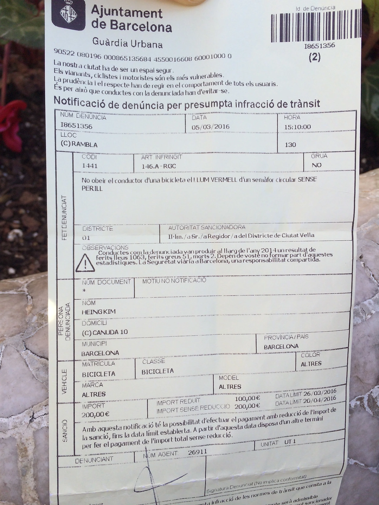우리에게는 거창한 계획이 있지 않은가. 배도 채웠으니 알차게 실천하기 위해 다시 자전거에 올라탔다. 이제부터 시작이다. 3분 후, 우리가 뜻하지 않은 시작을 한다. 우리는 경찰과 실랑이를 벌이고 있다. 사건의 전말은 이러하다. 경찰차에 타고 있는 경찰은 자전거를 타고 있는 우리를 불렀다. 스페인어를 이해하지 못해 손짓을 보고 인도에서 타라는 뜻인 줄 알고 우리는 인도로 올라갔다. 그러자 이번엔 우리를 아예 멈춰 세운다. 스페인어를 하나도 알아듣지 못하는 우리에게 스페인어로 말을 하니 서로 소통이 되지 않는다. 우리는 한국어를 할 수는 없으니 못 알아듣는다고 영어로 계속 말한다. 그러자 그쪽에서도 영어로 말한다. 한 단어, 100(One hundred) 유로. 100유로라는 단어를 듣고서야 이 상황이 잘못되가고 있다는 걸 깨달았다. 우리는 왜 100유로를 내야 하냐고 이해를 시켜줄 것을 요구했지만 그들은 영어를 할 의지조차 없었고 귀찮다는 듯이 100유로만 반복해서 말한다. 우리는 도망가지 않는다, 스페인의 법을 어겼다면 당연히 벌금을 낼 거다라며 이유만 말해달라고 했더니 돌아온 답은 Shut up (닥쳐)였다. 여자 경찰과 남자 경찰은 끝내 자전거를 잡고 있는 우리를 강제로 밀어내고 자전거를 가져갔다. 우리를 밀어내고 자전거를 빼앗는 그들한테 할 수 있는 말이라곤 영어나 한국어뿐이라 아무런 소용이 없었다. 단지 스페인 경찰이 우리에게 한 행동에 충격이었고 기분이 나빴다. 닥쳐라는 소리까지 들은 우리도 나름의 의견을 말했지만 돌아오는 대답은 우리는 스페인 경찰이다(Espanol Policia power) 뿐이었다. 아마 겁을 주려고 한 거 같은데 우리는 의도대로 겁을 잔뜩 먹어버렸다. 말도 안 통하는데 우리한테 어떤 일을 해도 당할 수밖에 없을 것 같다는 생각이 든다. 우리가 자리를 뜨지 않고 계속 말을 걸자 영어를 조금 할 줄 아는 경찰관이 왔다. 진작에 왔더라면. 그는 우리가 빨간 불에 건넜다면서 100유로를 내야 한다고 말한다. 우리는 바로 고개를 돌려 인도에서 달리는 자전거와 빨간 불에 신호를 무시하고 건너는 사람들, 더불어 아예 무단횡단을 하는 사람들을 본다. 왜 우리한테만. 게다가 경고도 아니고 바로 벌금을 물다니. 억울하다. 닥쳐라는 소리까지 들었는데. 최소한 설명과 예의는 있어야 하지 않나 싶다. 천국 같던 바르셀로나가 내 마음속에서 나락으로 떨어진다. 우리는 실망감을 감추지 못한 채 알았다고 대답하며 지금 현금이 없다고 말하니 자전거를 맡기고 나중에 100유로를 내도 된다고 한다. 우리는 이미 그들의 태도를 신뢰할 수 없어 몇 번이나 <경찰서에 가서 100유로를 내면 그것으로 끝이냐>고 물어보았고 그들은 그렇다고 대답한다. 다시 한번 알았다고 대답하며 기분이 상한 채로 자전거 대신 그들이 준 벌금 계산서를 들고 두 발로 걷기 시작했다. 한국에서 만약 경찰이 신호 위반한 외국인에게 Shut up이라고 했다면 어떻게 되었을까 생각하니 스페인에서는 절대 살지 말아야겠다는 다짐을 하게 된다. 우리의 계획은 그렇게 수포로 돌아갔다. 자전거 대신 대중교통을 타고 갈 수도 있었지만 애초의 우리의 계획은 '자전거를 타고'가 중요 전제였다. 자전거 없이 그럴 기분도 아니었다. 자전거를 빼앗기고 100유로를 내야 한다는 충격적인 사실은 의외로 시간이 지나자 이미 100유로는 내 것이 아니라고 느껴지면서 받아들이게 된다. 내가 스페인에 대해서 몰랐을 수도 있겠다 싶었지만 기분은 좀처럼 나아지지 않는다. 스페인어를 할 줄 모른다고 예의 없게 구는 그들의 태도에 화가 났다. 분노를 표출하며 우리는 무작정 걸었다. 걷다 보니 우연히 가우디의 건축물 중 하나인 카사 밀라 앞을 지나갔다. 건물을 보니 가우디가 왜 유명한지 알겠다. 하지만 그도 스페인 사람 아닌가. 스페인 사람마저 모두 싫어져서 그냥 쳐다보고 지나쳤다.
