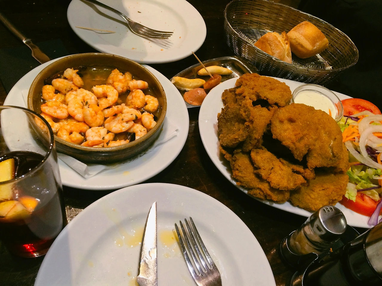 미술관 관람을 마치고 톡톡 튀는 그림을 지나 친구에게 추천받은 식당으로 갔다. 식당은 사람들로 가득 차 여러 명은 앉지도 못하고 서있기까지 했다. 사람들로 분주한 가운데 동양인은 우리뿐이다. 메뉴판을 받아 들자마자 유명하다는 새우와 바삭한 버섯 튀김을 시키고 빼놓을 수 없는 샹그리아도 한 잔씩을 주문한다. 샹그리아가 나오고 이어 바게트와 과자 그리고 소시지가 나왔다. 푸짐한 양과 저렴한 가격으로 맛있는 식사를 했다.