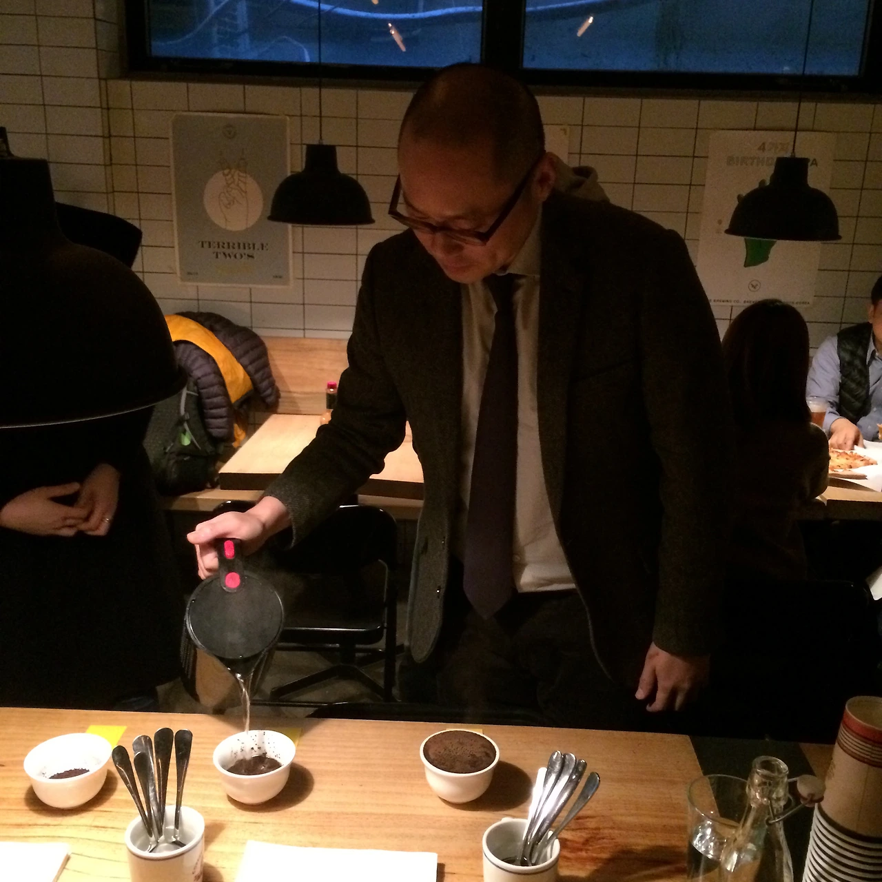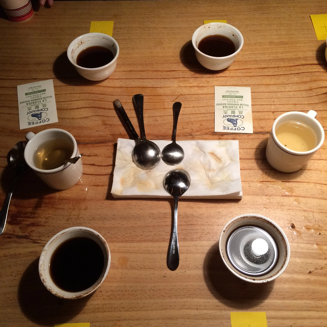 처음 맥파이에 도착하니 가운데 테이블에 커핑을 위한 커피 가루가 잔에 가지런히 담겨 있었다. 멀뚱멀뚱 서 있었더니 "커핑 하러 오셨나요?"라며 친절하게 물어봐주셔서 "네!"하고 10명이 도란도란 테이블 앞에 모였다. 테이블에 세팅되어있는 커피 가루는 정체를 알려주지 않고, 숫자 1234로 구분되어 있었다. 우리는 돌아가면서 차례로 4단계에 거쳐 커핑을 하였다.