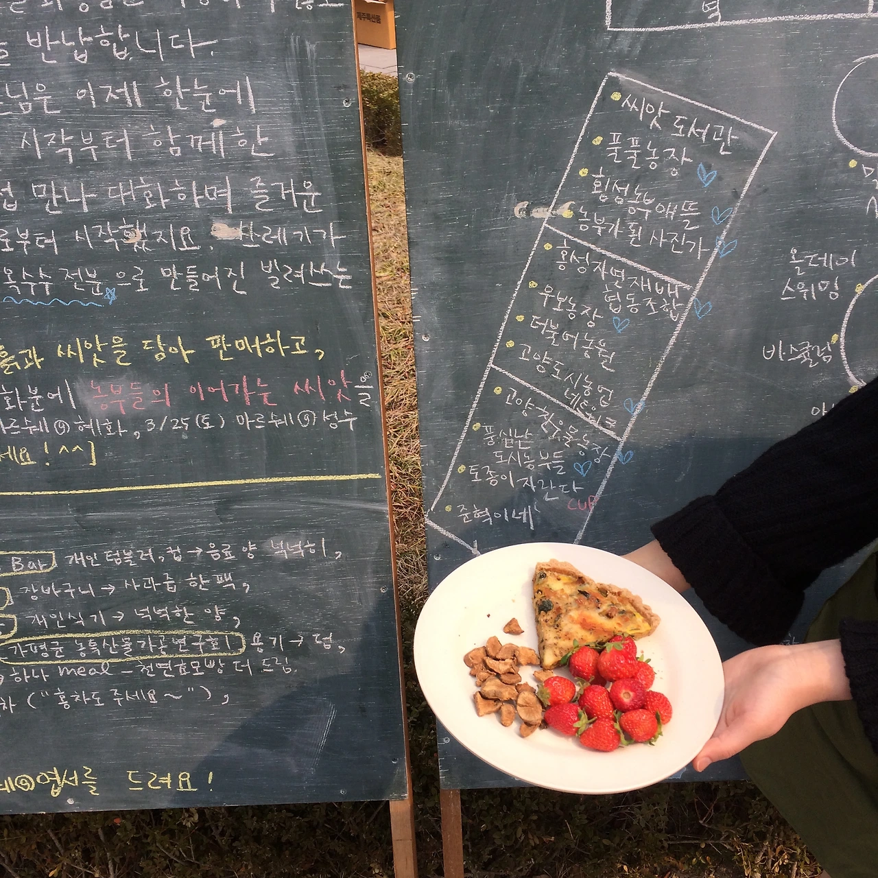 정말 많은 맛있는 음식 선물을 입으로 받았는데, 행복과 음식으로 배부른 하루였다. 특히 기억에 남는 음식을 기록하자면, 단연 시금치 키쉬를 빼놓을 수 없다. 나에게 키쉬란 기름진 피자와 비슷한 비싼 피자빵 같은 존재였는데 오늘 시금치 키쉬를 먹고는 새로운 키쉬 세계가 열렸다. 버터를 좋아하지 않으셔서 버터를 첨가하지 않고 앉은뱅이 통밀로 담백하고 건강하게 만든 키쉬는 담백하면서도 든든한 식사가 되었다. 그렇게 키쉬를 먹고 다른 서포터즈 분께 추천하여 키쉬 영업을 했고 큰 그릇에 키쉬를 담아 시장을 구경하다가 뜻밖에도 정을 듬뿍 담게 되었다. 딸기잼을 파는 곳에선 딸기를 듬뿍, 농부팀에서는 돼지감자칩을 듬뿍. 큰 그릇은 사랑이 듬뿍 담겨 오손도손 나눌 수 있었다.