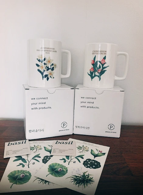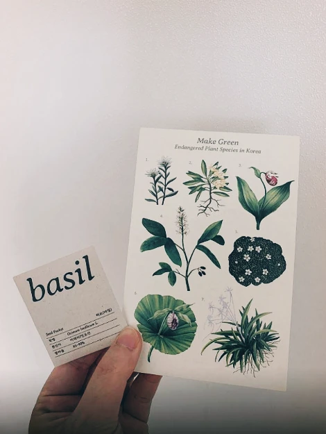그런 우리 부부에게 '바질씨앗' 한 봉이 도착했다. 유난히도 가물었던 올해 봄, 지독한 산불이 계속되고 새댁 주머니에서 조금이나마 보태보려는 찰나 제주도 희귀 식물 그림이 그려져있는 컵을 사면 기부활동을 함께 할 수 있었다. 그 컵과 함께 사은품으로 온 씨앗이었다.