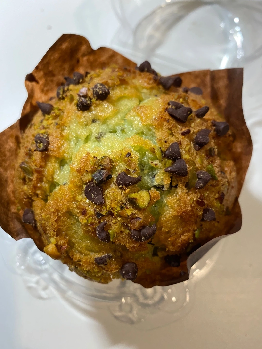 피스타치오 반죽에 작은 초코칩을 얹은 머핀입니다.