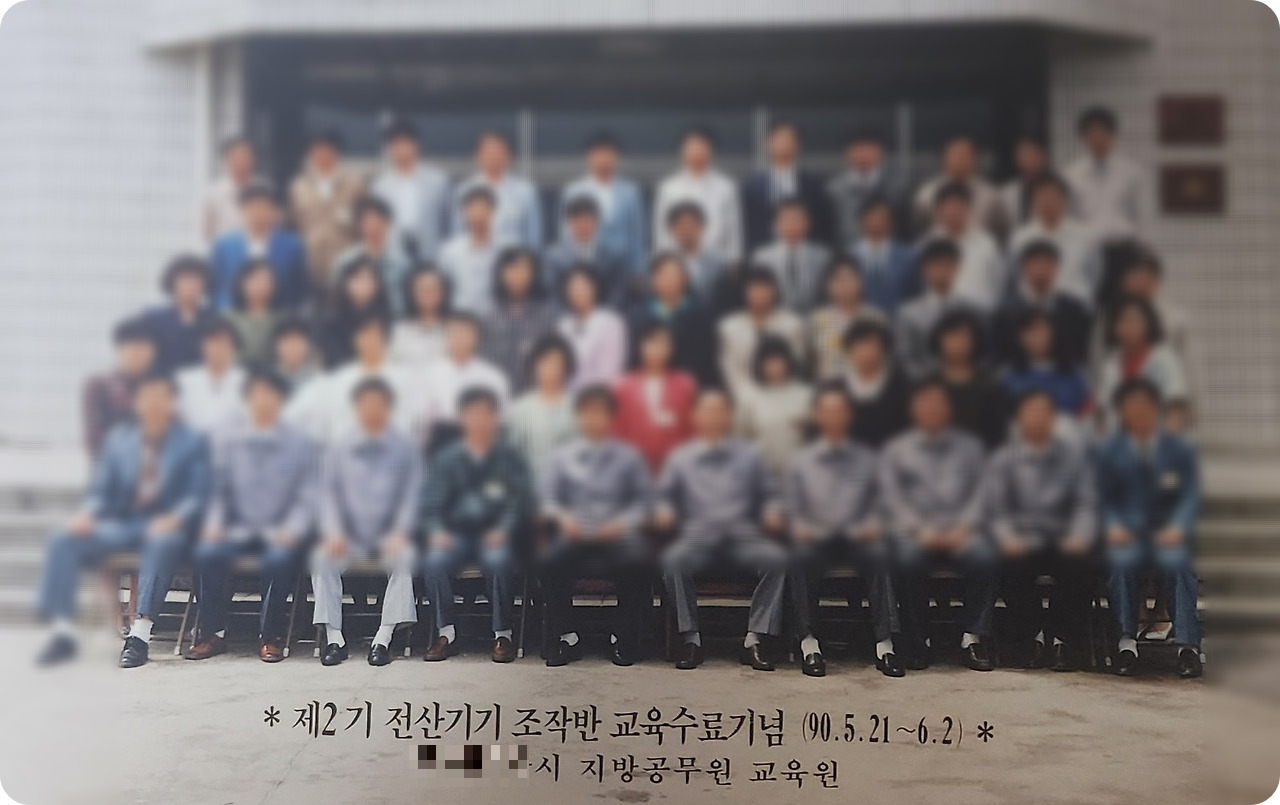 발령을 받고 그 당시 추진된 주민등록 전산화 작업으로 발령받은 지 3개월 만에 전산교육을 90.5.21~6.2까지 2주간 A시 지방공무원 교육원으로 가게 되었다. 당시 같이 발령을 받았던 동기 언니들과 같이 가게 되어 맘도 편했었다. 지금은 교육가도 사진을 찍거나 하지 않지만 그때는 수료증도 주고 교육생 전체가 사진을 찍기도 하였다.