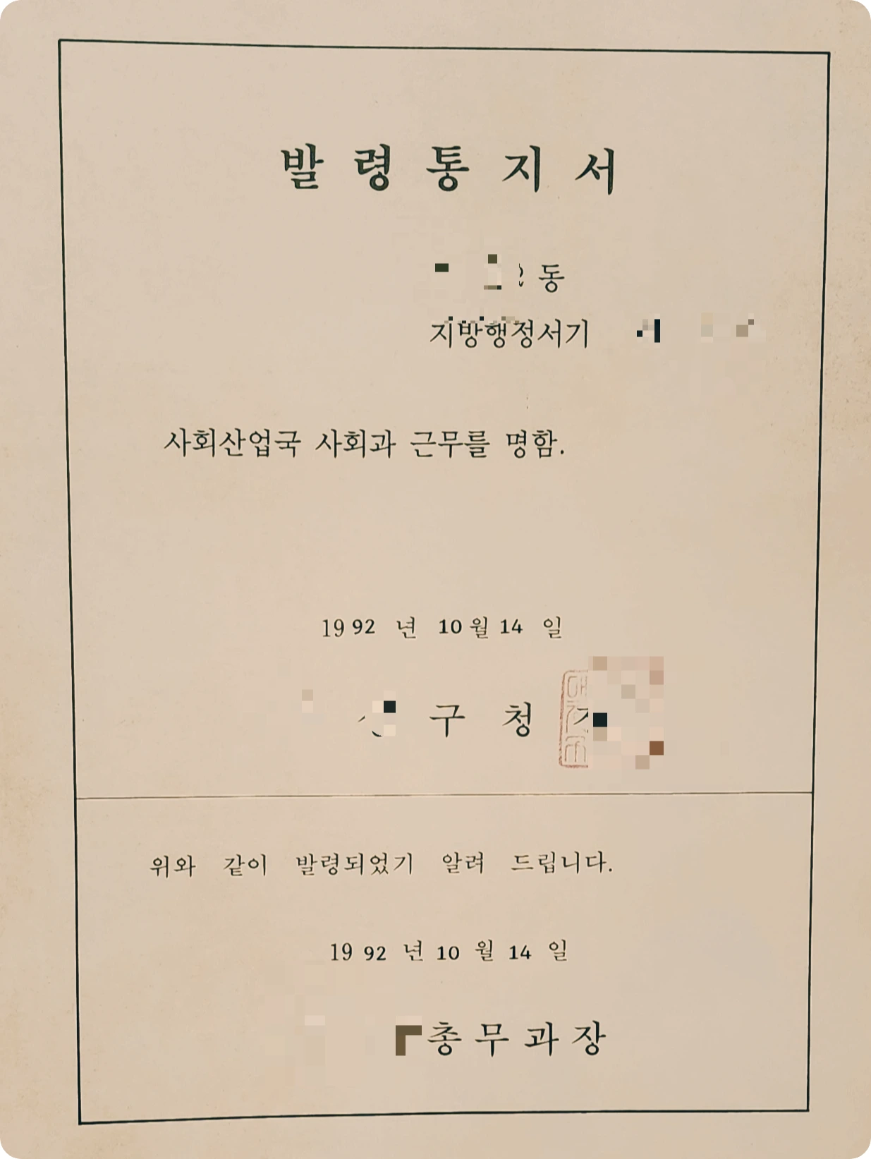 동사무소 두 곳에서만 근무하던 나는 처음으로1992년 10월 14일 A구 본청으로 발령이 났다.처음 수습을 받았던 사회과였다. 그 당시 사회과는 현재 복지부서에서 추진하는 업무를 하던 곳으로 공무원 첫 수습발령도 사회과, 본청 첫 발령도 사회과였으며, 이후 인사교류로 타시로 전입 후에도 나는 복지부서에 꽤 오랫동안 근무하는 등나와 복지는 아주 인연이 깊은 부서였다.