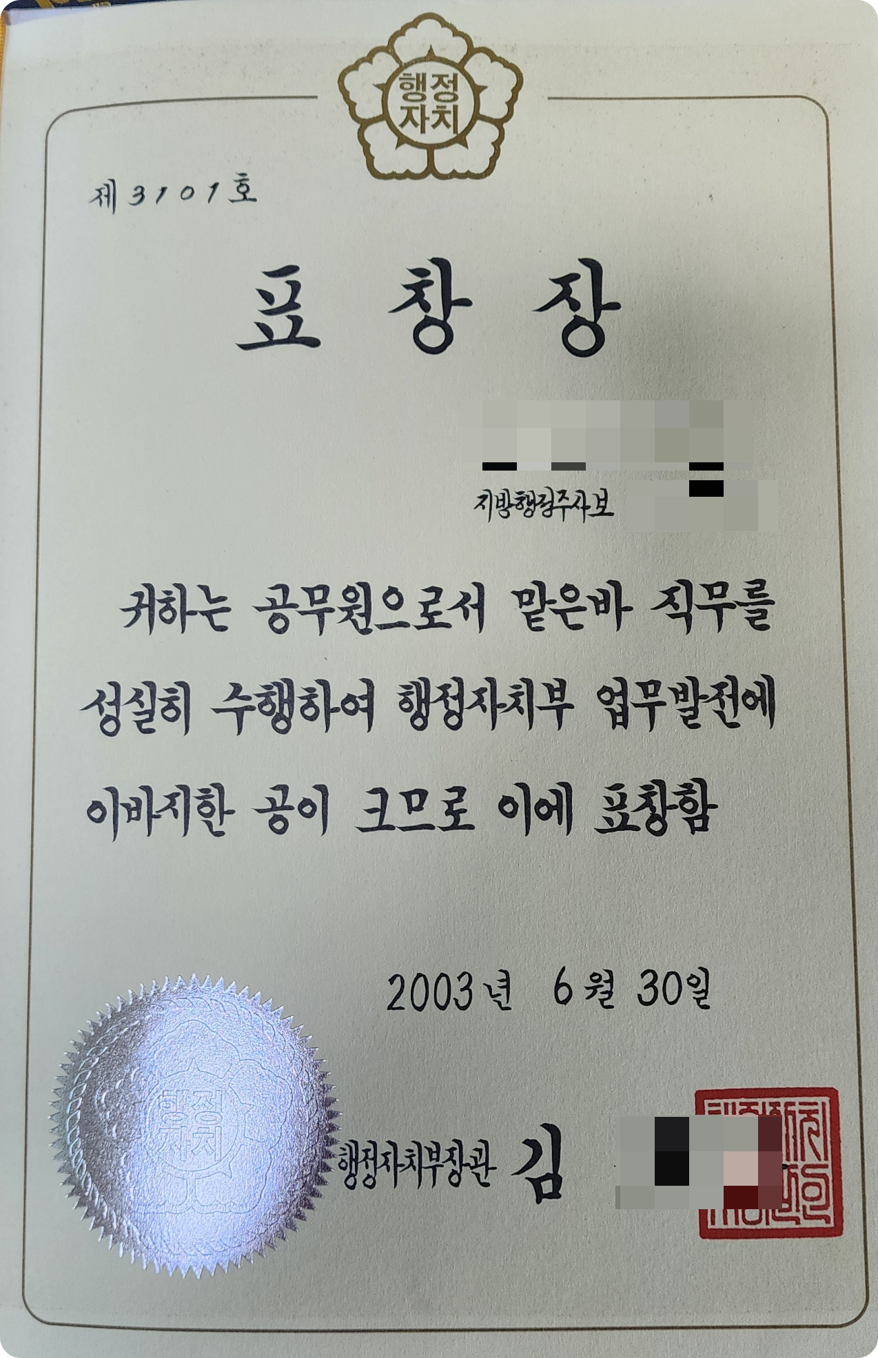 나는 전입을 왔기에 나를 모르는 사람들이 많았었다. 처음 근무해 보는 낯선 세무업무를 익히기 위해 지침도 집으로 가져가서 공부하고 열심히 하려고 하는 나를 예쁘게 봐주신 우리 팀장님께서 나를 장관상을 받게 추천을 해주셔서 나는 전입 온 지 3년 만에 운 좋게 장관상을 받았다. 정말로 고맙고 감사한 일이었다.