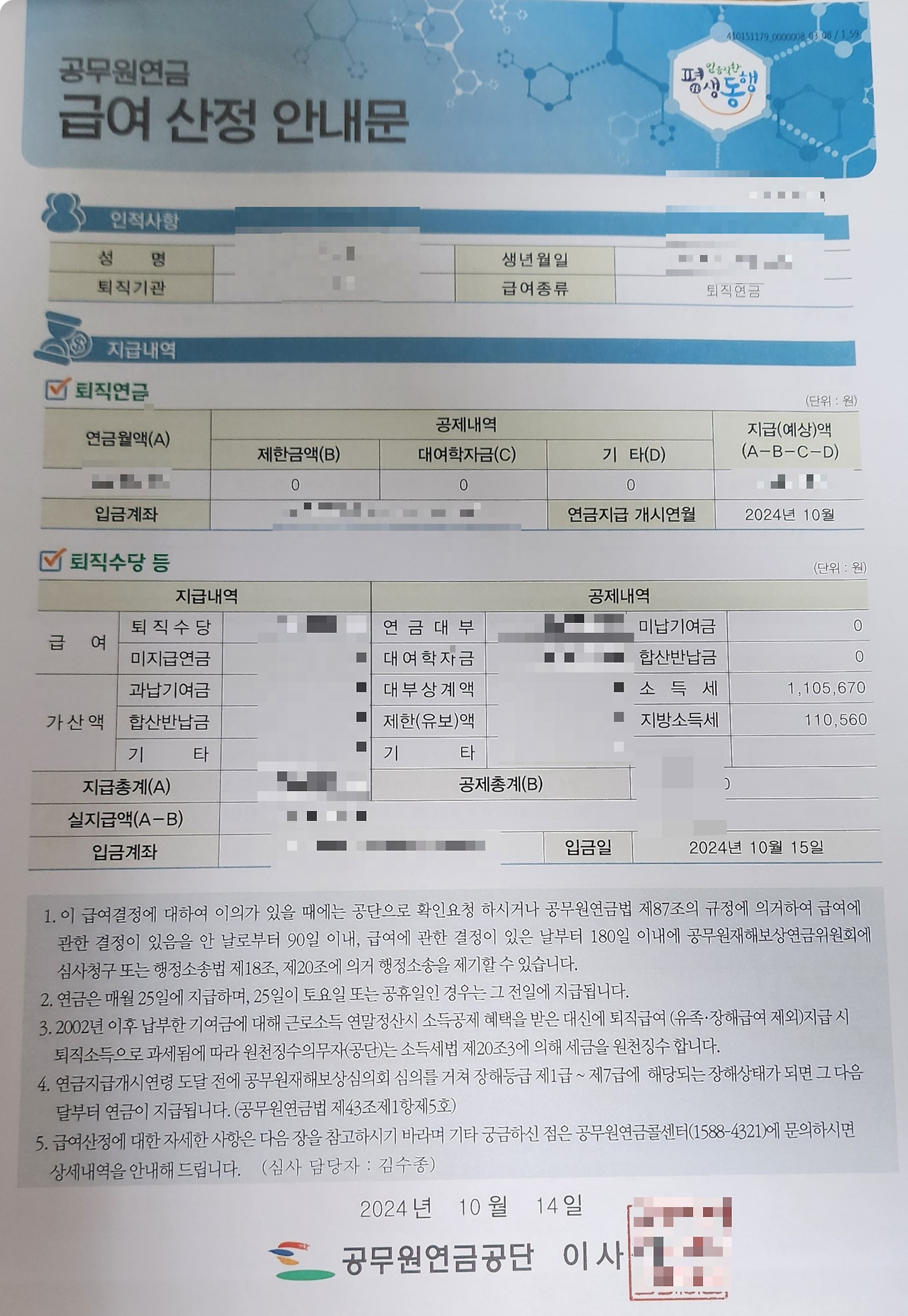 퇴직자가 공단 홈페이지에 퇴직수당을 신청하게 되면 관련 서류(명예퇴직일자 기재된 공문) 등 은 지자체 담당자가 공단으로 통보해 준다. 나 같은 경우 9.30일 신청하여 15일 후인 10월 14일 공무원연금 청구 처리가 완료되었다. (홈페이지에서 조회되었던 퇴직수당과 동일한 금액이 결정되었다.)