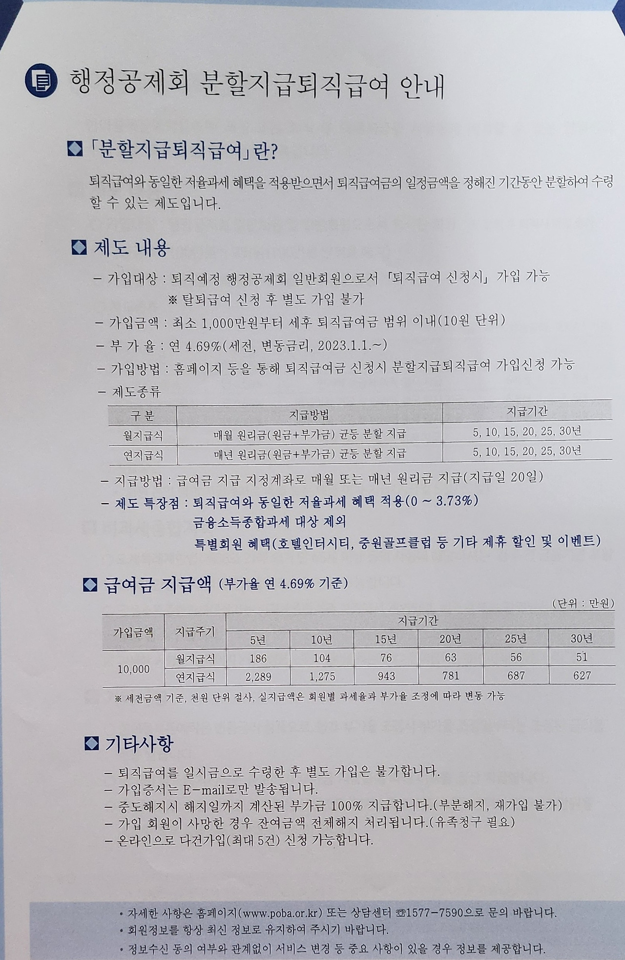 공제회비는 퇴직일 당일 전액 지급받거나 일부 또는 전부를 분할급여로 홈페이지에서 신청할 수 있다. 기간은 5년 ~30년 사이에 월액 또는 연액으로 신청할 수 있고 중도해지도 가능하다. 나는 퇴직 당일인 9.30일 분할급여(10년-월액)를 신청하여 10.2 처리 완료되었고 분할급여 지급일은 2024.11.20일이었다. 공제회비 증서는 따로 우편발송을 해주지 않고 메일로 증서를 송부해 주고 홈페이지에서도 출력이 가능하다.