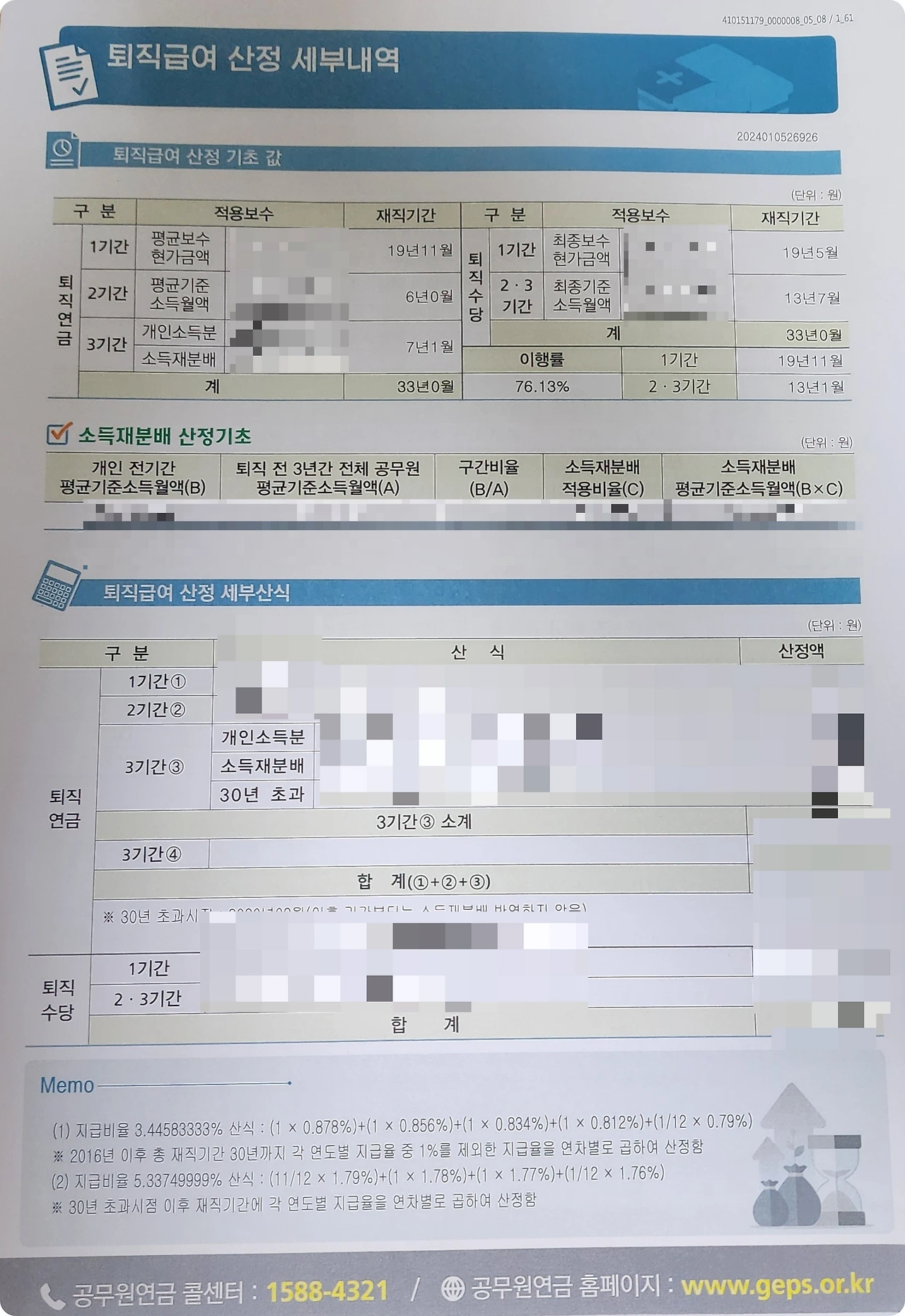 재직기간은 기여금 최대 공제기간이었던 33년으로 산정됨. (연금법 개정으로 현재는 35년이상 근무자는 기여금 미공제 됨 )
