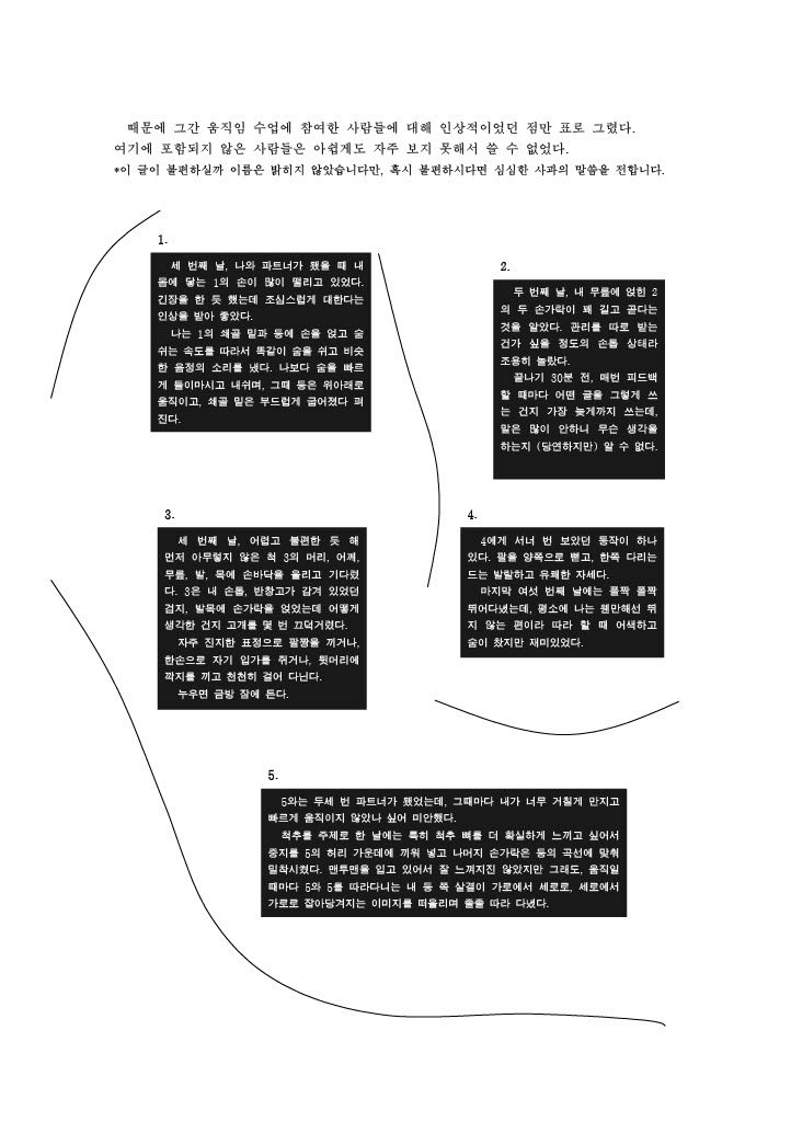 다들 어땠을까? 6주간, 이전에는 하기 어려웠던 모험을 할 수 있어 즐거웠다. 모험이라 함은 바로 몸을 느끼는 것, 누군가의 몸을 따르거나 이끌고 만지는 것이었다. 손가락, 손바닥, 손목, 팔꿈치, 어깨, 가슴, 배, 허리, 골반, 발가락, 발바닥, 발목, 무릎, 허벅지, 머리, 눈꺼풀, 눈동자, 혀. 할 이야기가 너무 많아서 다 말할 수 없다.