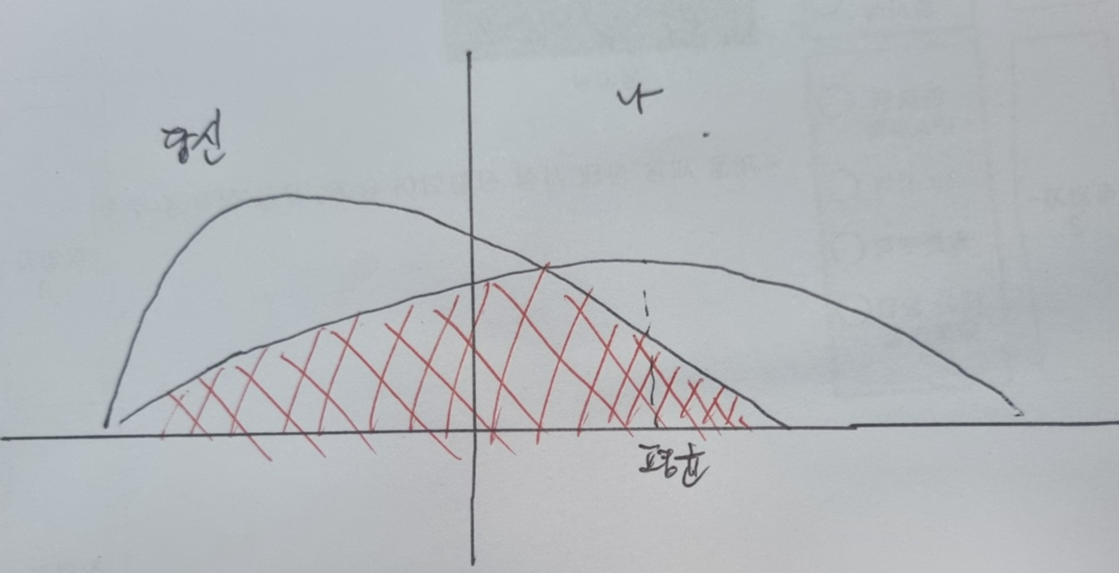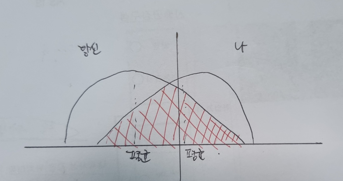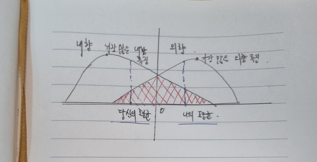 아내와 나에 대해서 정규 분포를 그려보면 대충 위와 같은 그림이 될 것 같다. 붉은색으로 빗금 친 부분은 서로의 행동을 이해할 수 있는 확률이 있는 구간이지만, 그 외 영역은 이해되지 않는 확률이 있는 구간이다. 이 그래프는 내향과 외향으로 구분했지만 사실 모든 영역에서 표현이 가능하다.