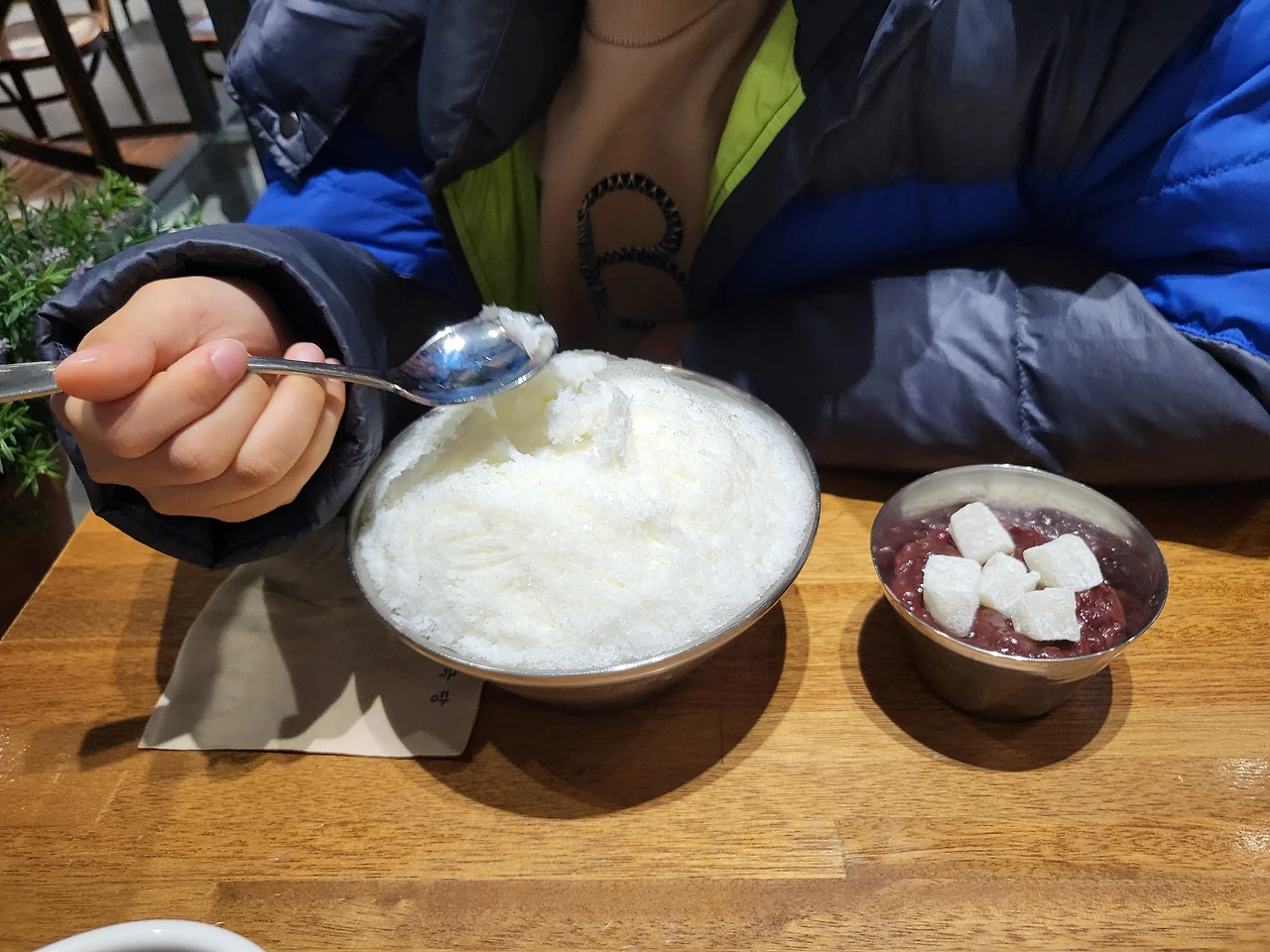 팥 한번 떠먹고 얼음 따로 먹는 스타일. 팥이 달콤해서 차가운 얼음이랑 잘 어울린다고. 말없던 아이가 이렇게 팥빙수에 대해 할 말이 많을까. 신이 난 게 느껴져 이럴 때 참 뿌듯하다. 이게 뭐라고.