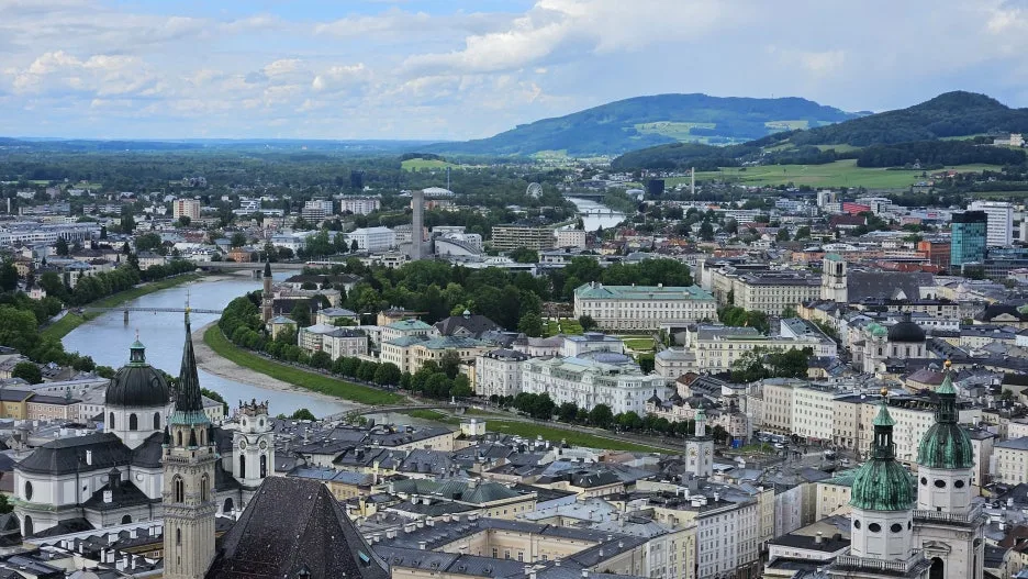 그곳 전망대에서 내려다보는 잘츠부르크의 풍경은 정말 절경이었다. 풍성한 잘츠강이 완만한 'S자'를 그리며 도시를 감싸고 있었다. 미라벨 정원에서부터 내가 걸어왔던 모든 곳을 내려다볼 수 있었다. 특히 바로 앞에 내려다보이는 맑은 하늘 아래 대성당의 비취색 돔은 조금전 우중의 그것과는 완전히 다른 모습으로 빛나고 있었다.