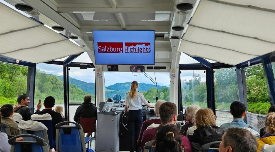 유람선은 멋진 유니폼 차림의 젊은 금발의 여성 선장님이 키를 잡고 있어 눈길을 끌었다. 사방이 통유리창으로 둘린 유람선은 잘츠강을 거슬러 올라가며 강에서 바라보이는 도시 풍경을 선보였다. 조금 전 갔다 온 산성과 대성당의 돔이 친근하게 다가왔다. 아름다운 건물들이 있는 도심을 벗어나자 멀리 알프스 산지의 설산들이 강줄기 끝으로 펼쳐졌다. 주변이 숲으로 우거진 어느 곳에서 배는 기수를 돌렸다.