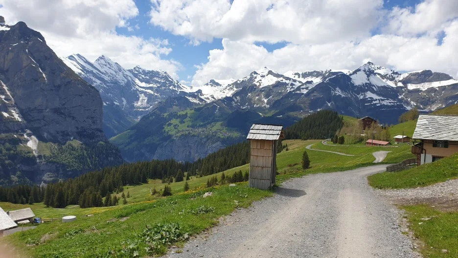 길은 벵겐역을 향하는 산악 철길을 좌우로 오가며 나 있었다. 중간에 자그마한 산속 기차역 플랫폼을 지나기도 하고 산중 호텔 같은 건물 앞을 지나기도 했다. 푸른 풀밭과 나무들 사이로 좁은 철길을 따라 끼-끽- 덜컹거리며 빨리 달리지 못하는 노란 기차와 저 멀리 솟은 하얀 설산들을 보고 있노라면 너무도 비현실적인 느낌에 이게 꿈인가 싶어진다. 내가 지금 어디에 있는 건가? 평생 처음 보는 풍경과 상식적으로 공존하기 어려운 것들이 입력되다 보니 뇌 회로가 감당하지 못하고 인지부조화에 빠져 시간과 공간 감각마저 아득해졌다.