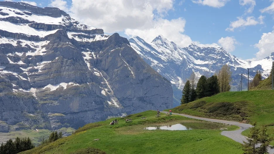 푸른 풀밭과 나무들 사이를 휘감고 달리던 길이 얼마 가지 않아 작은 연못에 이르렀다. 연못 가에는 나무 벤치가 준비되어 있었다. 햐~ 이런 기가 막힌 뷰 포인트가 있다니! 아이거, 묀히, 스핑크스전망대 그리고 융프라우 정상까지 거대한 설산의 능선을 바로 코 앞에서 한눈에 조망할 수 있는 명당이 아닐 수 없다. 그곳 벤치에 앉아서 깨끗한 날을 허락하신 신께 감사드리며 바로 앞에 병풍같이 펼쳐진 설산들을 요목조목 감상했다.