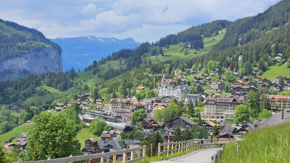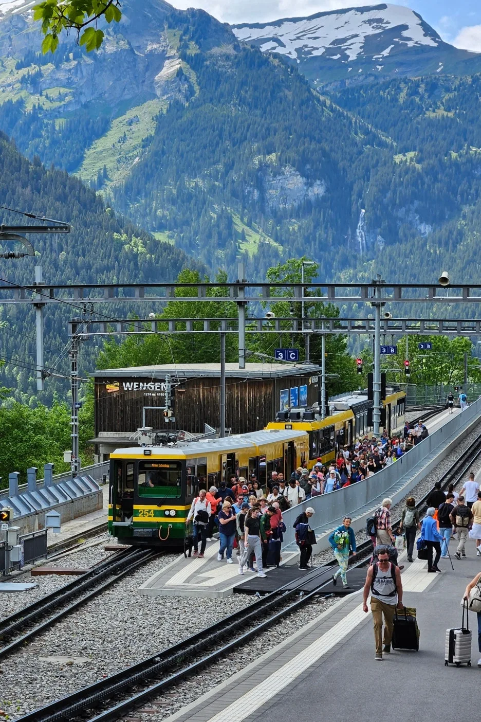 돌로 된 철교 밑을 지나고 탁 트인 언덕도 지나고 울창한 숲도 지나며 한참을 내려오니 멀리 작은 마을이 맞아 주었다. 멀리 설산을 품은 예쁜 꽃과 정원으로 잘 단장한 통나무집들 사이로 난 마을 길을 걸어 나와 벵겐역에 도착하니 막 기차에서 많은 사람들이 내리면서 조용한 마을에 활기를 불어넣고 있었다.
