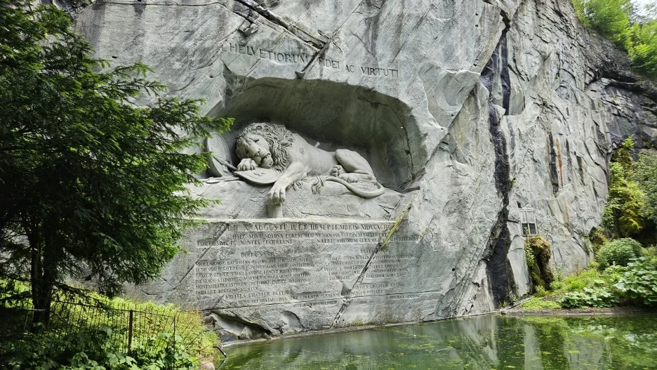 빈사의 사자상은 생각보다 훨씬 커서 놀랐다. 하얀바탕의 암벽에 화살을 맞고, 창과 방패를 깔고 힘없이 죽어가는 사자 상를 깍아 놓았다. 현장에 있는 안내판 내용을 찍어서 AI 앱에게 물어보니 친절하게 답해 주었다. 관광가이드가 따로 필요 없을 정도다. 요약하자면 1792년 프랑스 대혁명 당시 혁명시민군에 맞서 루이16세 국왕을 피신시키고 끝까지 궁전을 사수하다 전멸한 스위스 용병의 용맹과 충성을 기념하는 조각상이었다.