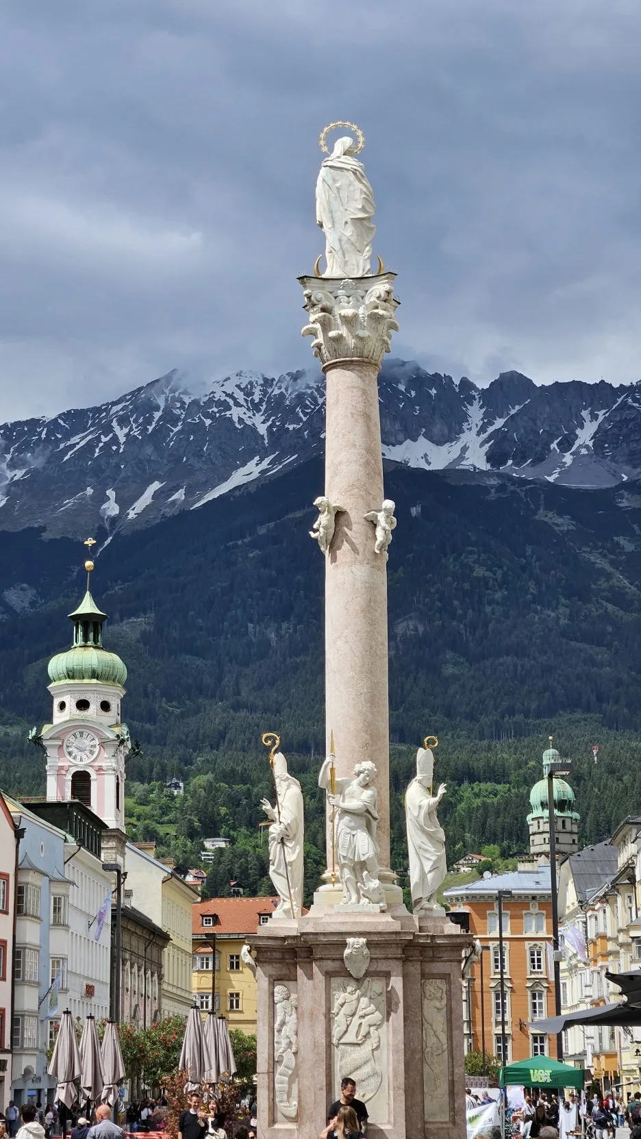 전쟁의 승리를 기념하여 지어진 성 안나 기념탑 주변에는 많은 관광객들로 붐볐다. 탑 위의 금빛 별 모양 아우라를 두르신 마리아님의 무심한 듯 고혹적인 자태는 참으로 예술적이고 아름다웠다. 스크린 보호 화면에 봤던 것보다는 실제로 보니 그렇게까지 크지는 않아서 살짝 실망하기도 했지만 이내 광장의 크기와 주변 건물 높이들과 딱 어울리는 규모인 것을 알 수 있었다. 이렇게 해서 인스브루크에서의 버킷리스트 하나를 지웠다.