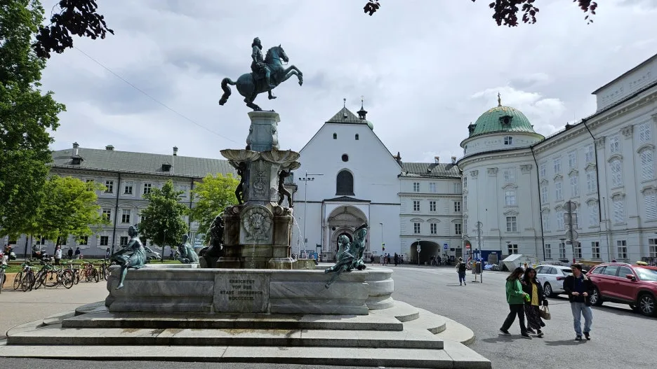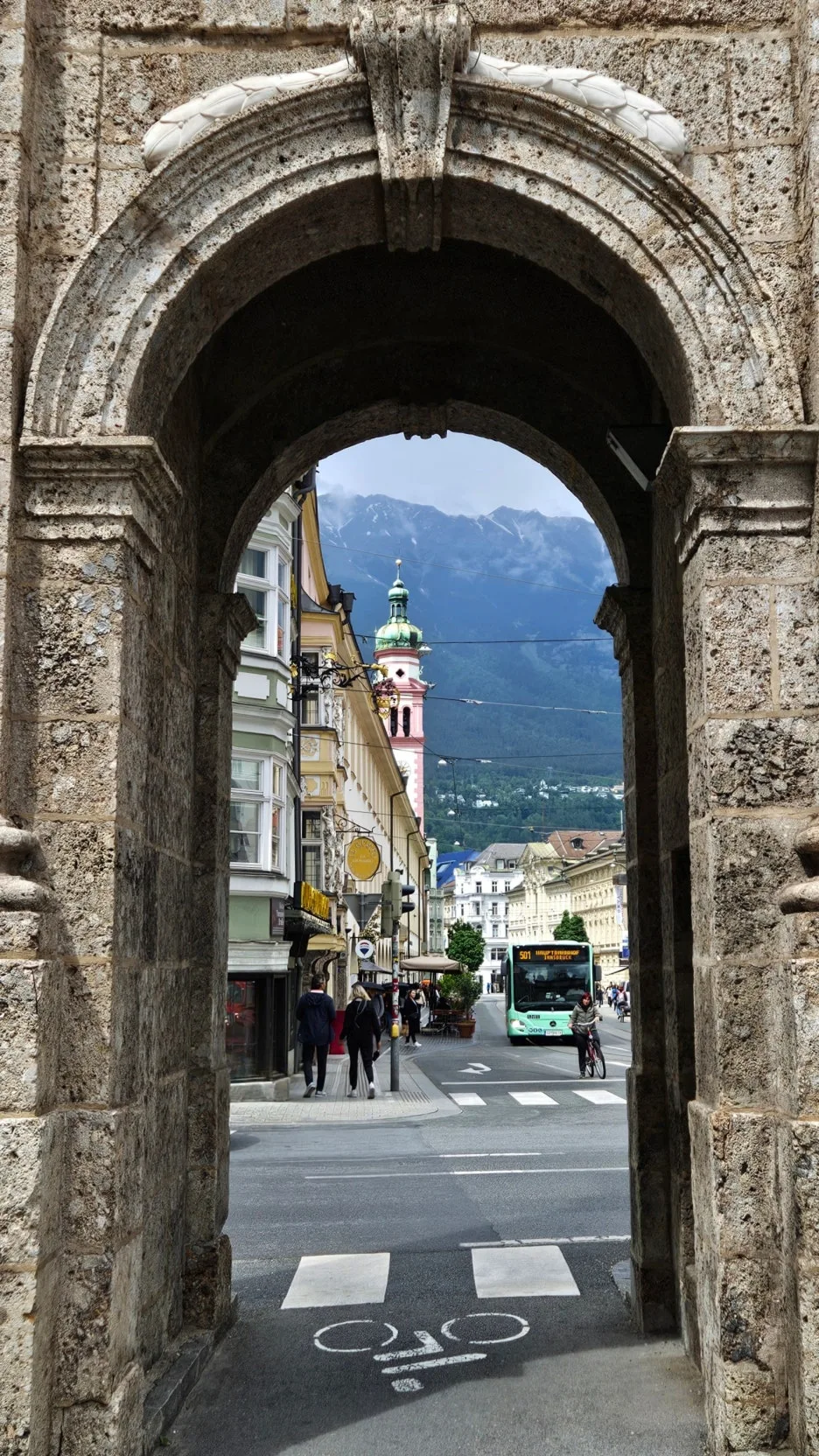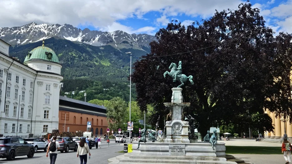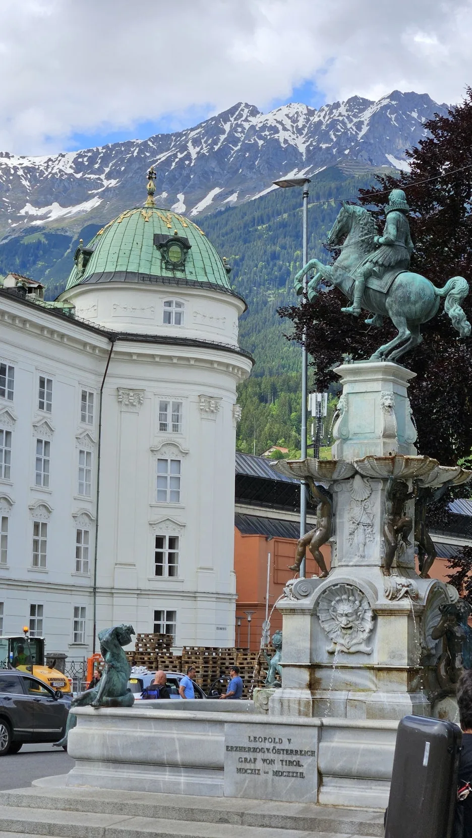 그때였다. 동상의 뒷편을 돌아서 우측으로 오는 순간 나는 숨이 멎는 줄 알았다. 동상 뒤로는 하얀 왕궁 건물과 화려한 비취색 돔이 그리고 그 뒤로는 웅장한 푸른 설산이 나를 내려다보고 있는 것이 아닌가! 인간이 만든 조형물의 아름다움에 취해 있었는데 갑자기 신이 만드신 자연의 웅장함과 아름다움까지 함께 맞이하려고 하니 뇌가 감당할 수 없어서 잠시 멍하니 그 자리에 서 있을 수밖에 없었다. 좁은 골목에서 나와서 미쳐 뒷배경을 인지하지 못하고 있었던 것이었다. 말 그대로 인스브루크의 아름다움에 압도당하는 순간이었다.