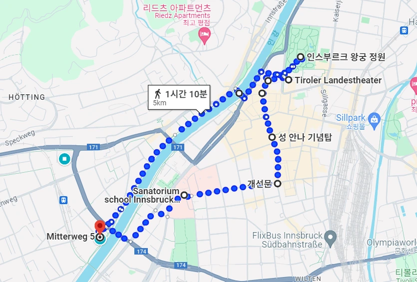 오래지 않아 인강의 '아름다운 하우스들'이 나타났다. 배산임수, 인강을 앞으로 두고 설산을 뒤로 등진 인스브루크의 아름다운 집들을 연신 핸드폰 카메라에 담았다. 이로써 또 하나의 버킷리스트를 지울 수 있었다. 잘 정비된 강뚝과 산책길을 따라 숙소로 돌아올 수 있었다.