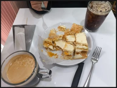 맛이 너무 궁금해서였을까요. 카메라를 꺼내들기보다는 본능적으로 포크부터 들게 되었습니다. 그래서 먹기 전의 사진을 못 찍었습니다. 나폴레옹 케이크는 얇은 페이스트리 층을 여러 겹 쌓고, 부서진 파이 가루를 위에 뿌린 형태입니다. 이는 겹겹히 무너진 나폴레옹의 군대를 상징하는 것일까요? 나폴레옹 전쟁의 남은 잔해를 뜻하는 것일까요? 답은 이 케이크를 처음 만든 제빵사만 알고 있을 것입니다.