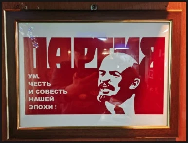 액자의 레닌은 사회주의 사상을 혁명을 통해 현실화한 사람입니다. 세계 최초의 사회주의 실험 국가를 만들었죠. 하지만 1991년 소련의 해체로 이 실험은 끝났습니다. 인류의 해방이란 원대한 꿈을 안고 시작된 여정은 결국 이상과 다르게 흘러간 것입니다. 액자에 담긴 흰 글자는 일장춘몽처럼 활자로만 남아 있습니다.