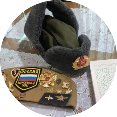 유독 눈에 띄는 물건이 있었습니다. 모자에 박힌 소비에트 사회주의 공화국의 상징 배지와 레닌의 얼굴이 담긴 액자였습니다.