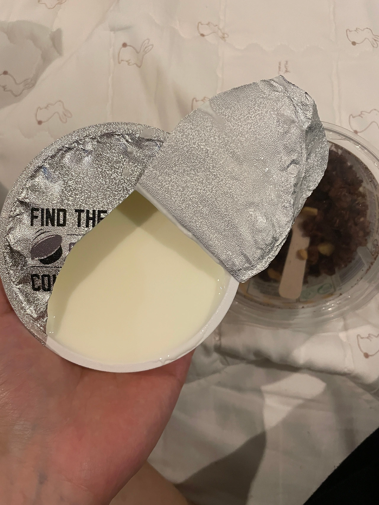 집에 와 요플레 뚜껑을 여는데, 뚜껑의 하얀 부분이 문득 눈에 들어왔다. 요플레가 묻어 있었던 것이다.
