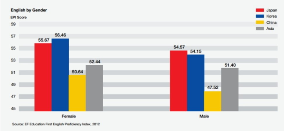 불과 10년 전만 해도 사실 한국인의 영어 실력은 그럭저럭의 수준이었다. 2012년 EF EPI (영어 능력 지수)에서 한국은 100점 만점 기준 55.3점을 기록하여 53개 국가 중 (21위)를 기록하였다. 말 그대로 '보통'의 수준이었다. 또 동아시아 3개국 한. 중. 일을 비교하는 부분에서 한국이 일본(22위)에 아주 근소한 차이로 앞섰고 중국(36위)으로 크게 앞섰다. 그리고 여성은 남성보다 조금 더 나은 수치를 보였다. 이 결과는 54개국의 170만 명의 사람들을 대상으로 지난 3년간 온라인 테스트를 통해 실시된 매우 공신력 있는 기록이다.