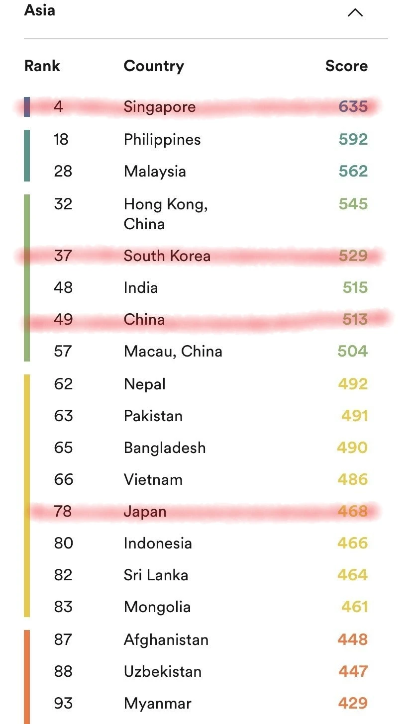 셋째, 탈아시아를 꿈꾸는 싱가포르이다. (4위)라는 수치는 상당 부분 상위에 랭크된 유럽과 나란히 하고 있는 순위이다. 과거 영연방국의 일원으로써 역사적, 정치적, 경제적인 부분과 결부되어 모국어를 영어로 지정한 국가적인 노력이 현재는 영어를 매우 잘하는 나라로 만들었다.