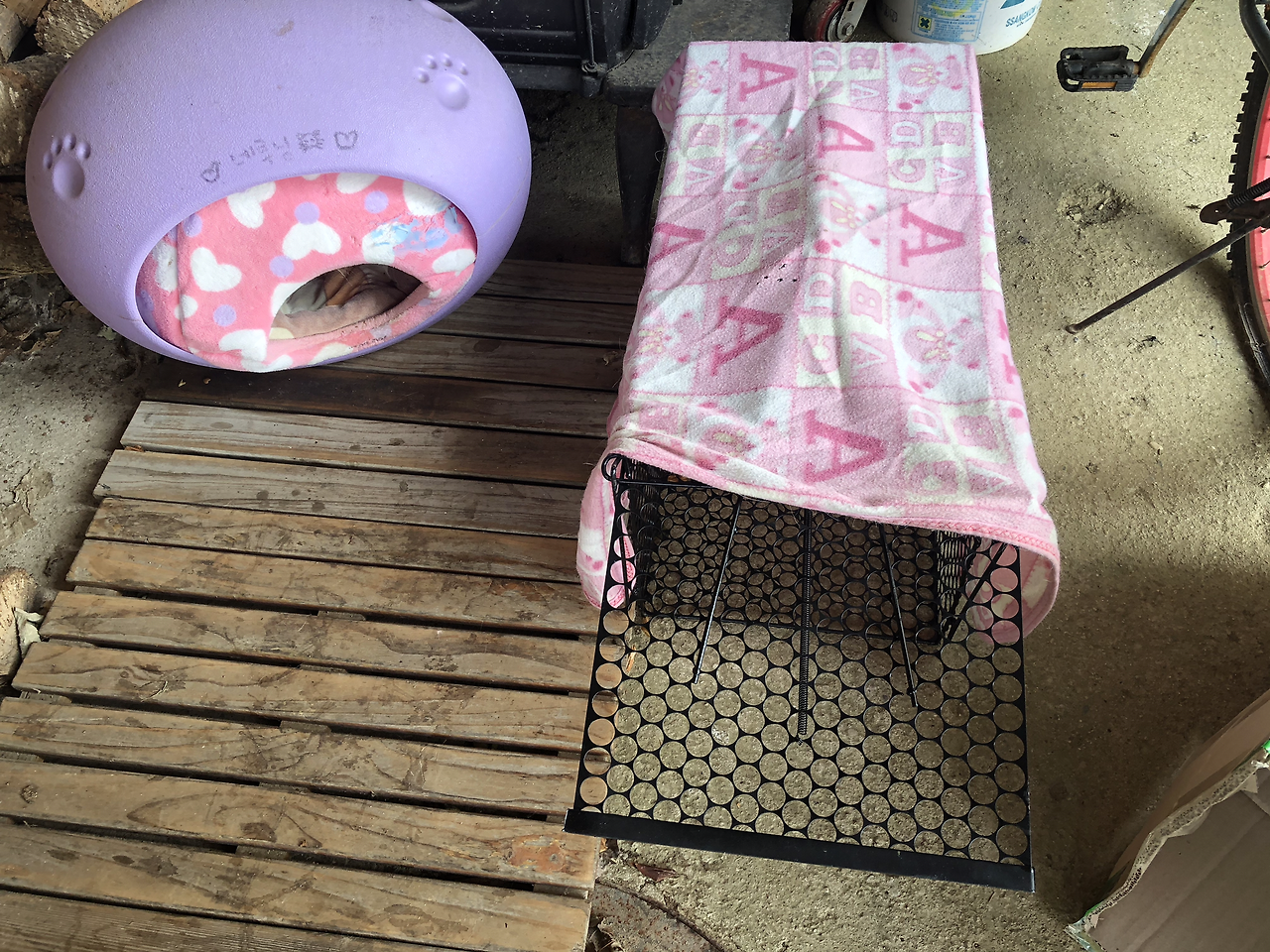 그런 이후로 먹이를 가져다 놓아도 포획틀 근처에 잘 접근하지 않는다. 이거 치즈를 잡으려다(포획) 진짜 치즈를 잡을 것(굶어 돌아가심;;;) 같아서 일단은 사료와 통조림을 가져다주었다. 치즈는 내가 없는 동안 조용히 먹이를 먹고는 어디론가 사라졌다. 낮동안에 중간중간 관찰해 보니까, 치즈는 내가 차고에 마련해준 평소의 잠자리에 들어가지 않고 집 주변 여기저기를 배회하고 있었다. 내 생각에 아마도 자기 집 옆에 설치해둔 포획틀이 신경 쓰여 아얘 집 근처에 가지 않는 것 같았다. 보통 때는 동굴집에 들어가 쉬던가, 방석에 올라가 식빵을 굽던가 했는데, 아얘 근처에 오지를 않는다. 날도 추워지는데, 녀석을 먼저 챙겨야겠다는 생각에 일단 포획틀을 치워 버렸다. 통조림을 곁들인 사료와 깨끗한 물도 다시 차려놓았다. 그런데도 뭐가 의심쩍은지 한밤중이 되도록 치즈는 집으로 돌아오지 않았다.ㅠㅠ