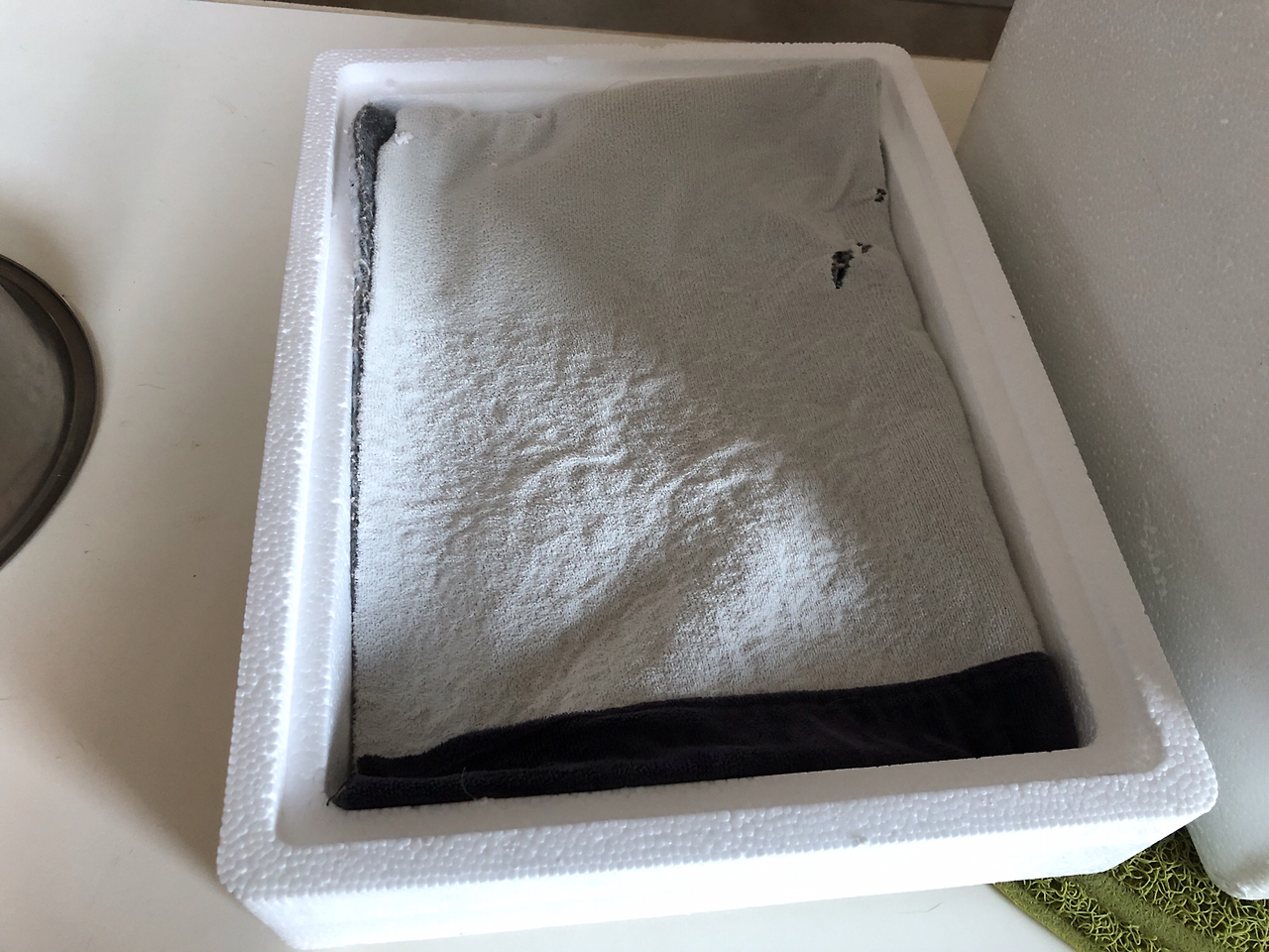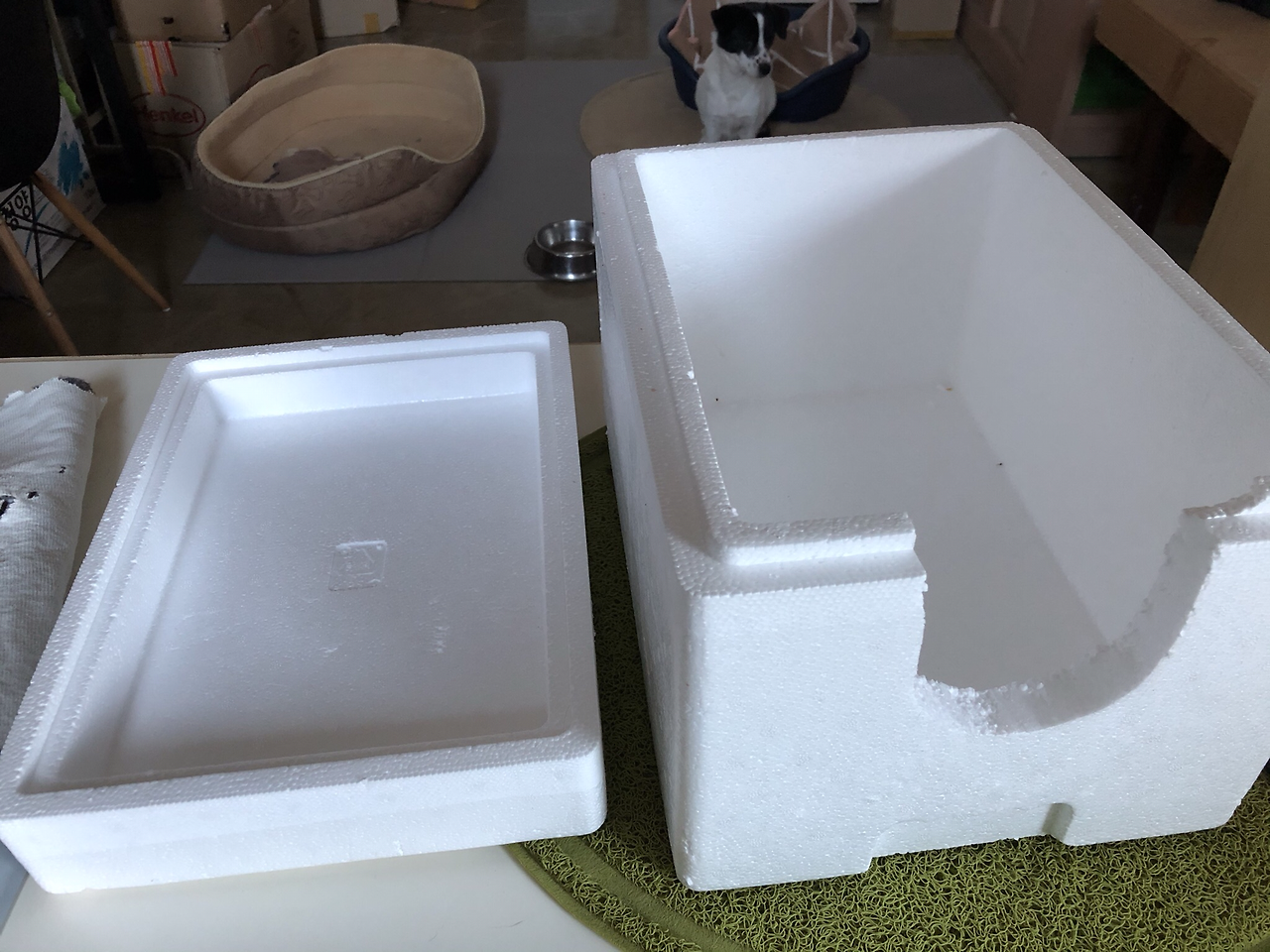 그래서 그동안의 추위를 피할 집을 하나 더 만들었다. 마침 김치도 떨어지고, 스티로폼 상자로 고양이 겨울 집을 만들어 주면 따뜻하다는 이야기를 들은 적이 있어서 가끔 김치를 주문해 먹는 업체에 김치 10kg을 주문했다. 예상대로 스티로폼 박스의 크기가 딱 적당했다. 아니 좀 작은 것 같기도;; 여하튼, 도착한 김치를 얼른 냉장고로 옮겨 넣고, 뚝딱뚝딱 치즈의 겨울 집을 만들었다.