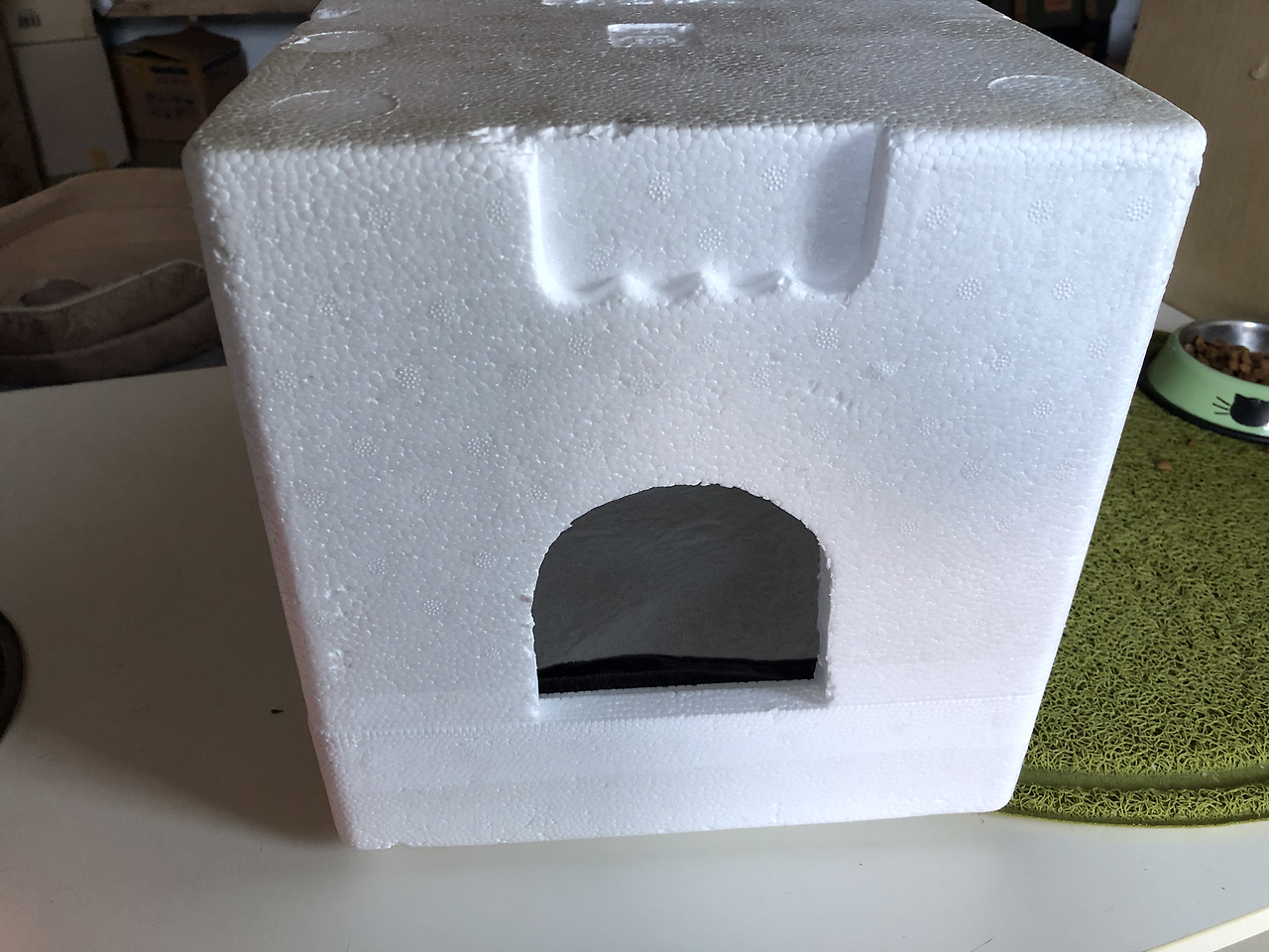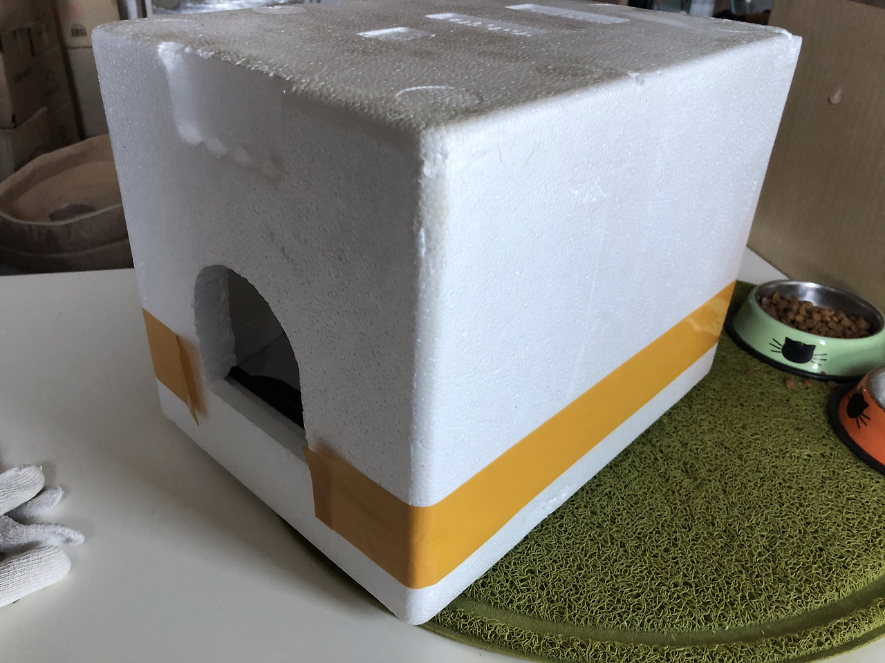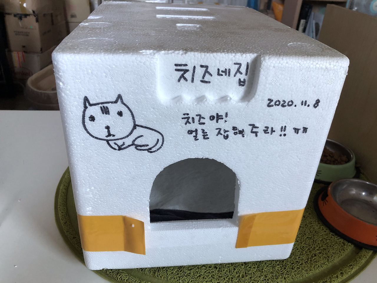 5분 만에 완성한 스티로폼 집을 기존의 집 옆에 가져다 놓았다. 과연 치즈가 이 집을 이용해 줄지는 모르겠지만... 노란 통덫이 도작하기 전, 치즈가 따뜻하게 지내길 바라며 오늘은 20000...